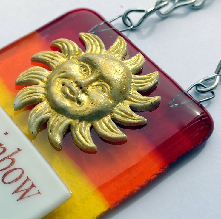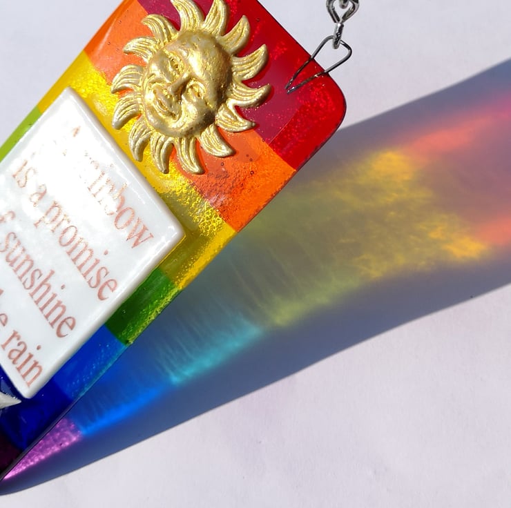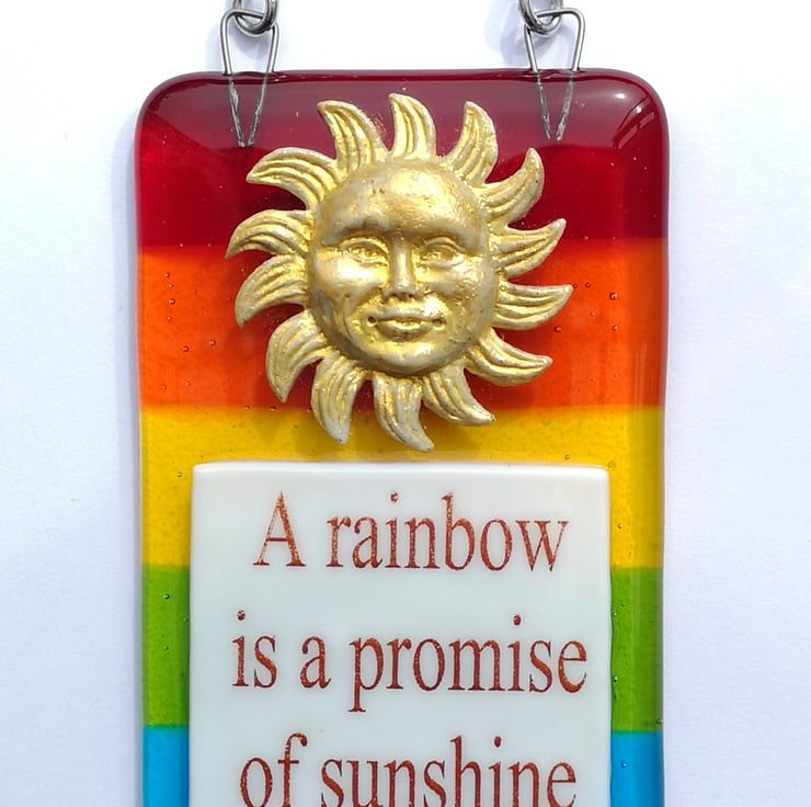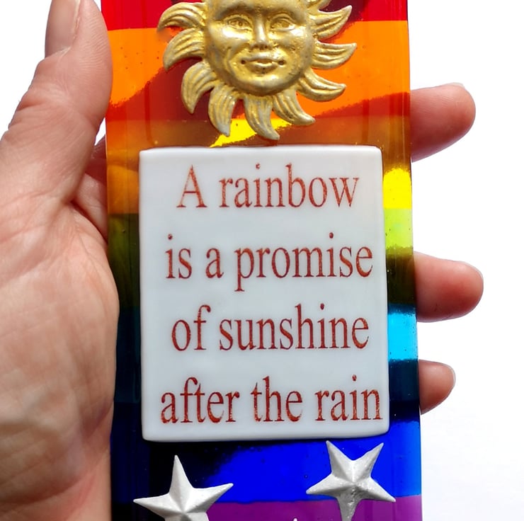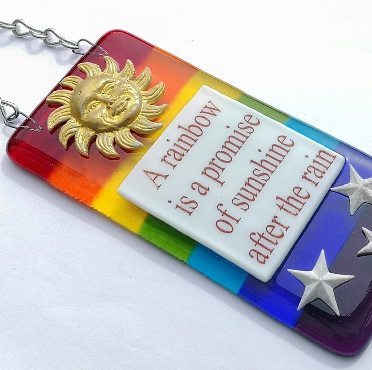 'A rainbow is a promise of sunshine after the rain' hanging picture, hung with chain. Handmade from glass that has been fused in a kiln, using only fully tested & compatible best quality art glass. The 3D sun & stars are made from powdered glass which I turn into a clay. They are then permanently fused onto the glass base in a kiln.