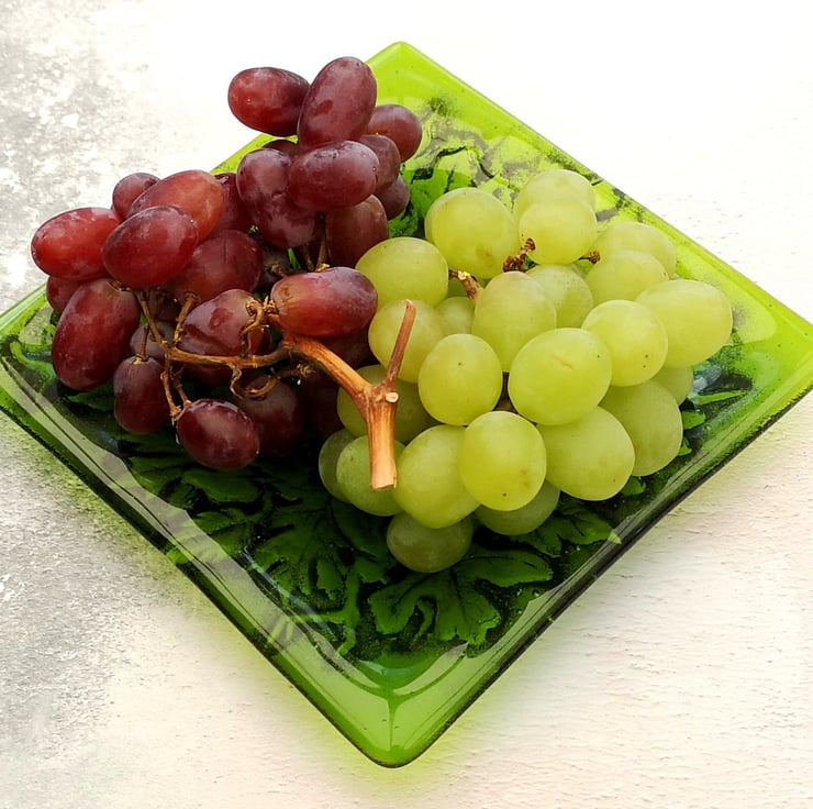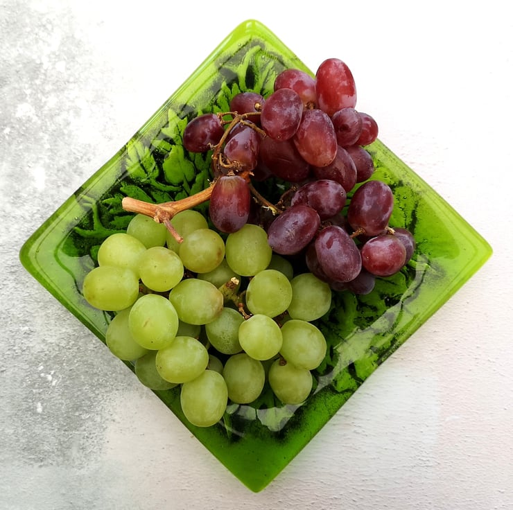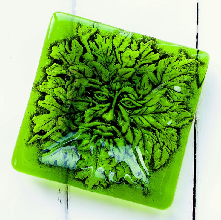 A Greenman Square Bowl Dish. Handmade from glass that has been fused in a kiln, using only fully tested & compatible best quality art glass. The Greenman image is imprinted into the underside of the glass. The picture is then fired in the kiln a second time after other colours of powdered glass have been added to the imprint to highlight the image. Then it goes back in the kiln again for a third time to slump it into the bowl shape.