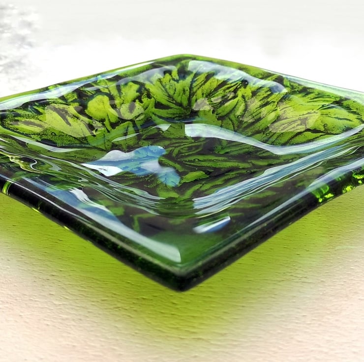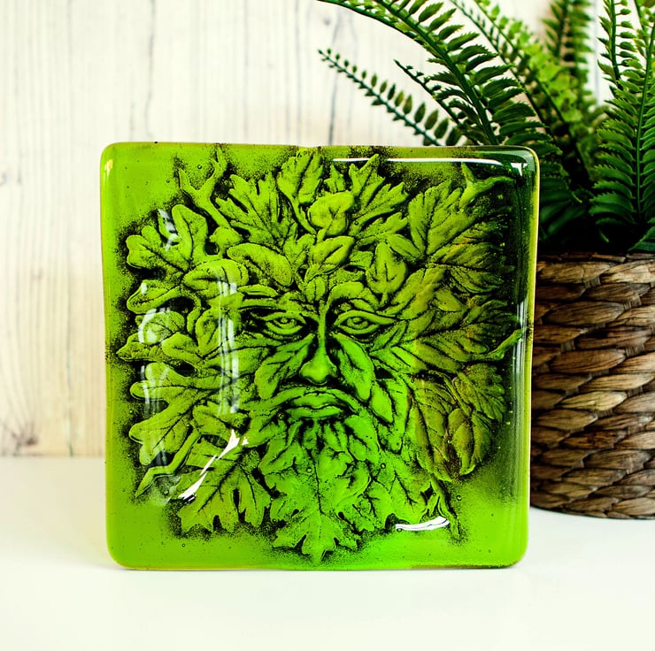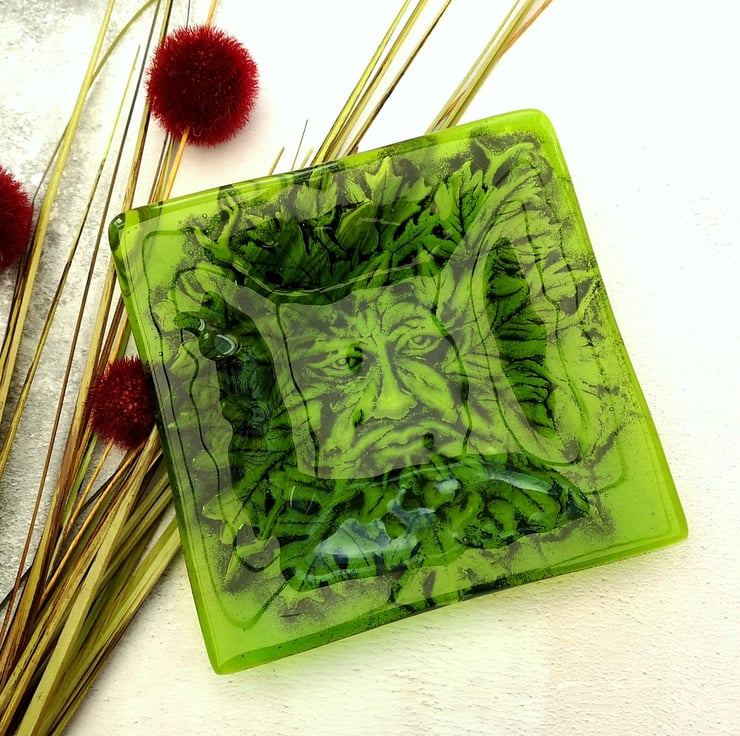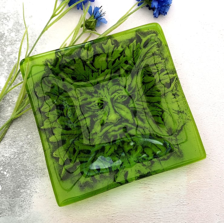 Handmade Fused Glass Greenman Square Bowl - Green Man Decorative Dish - Ash Tray