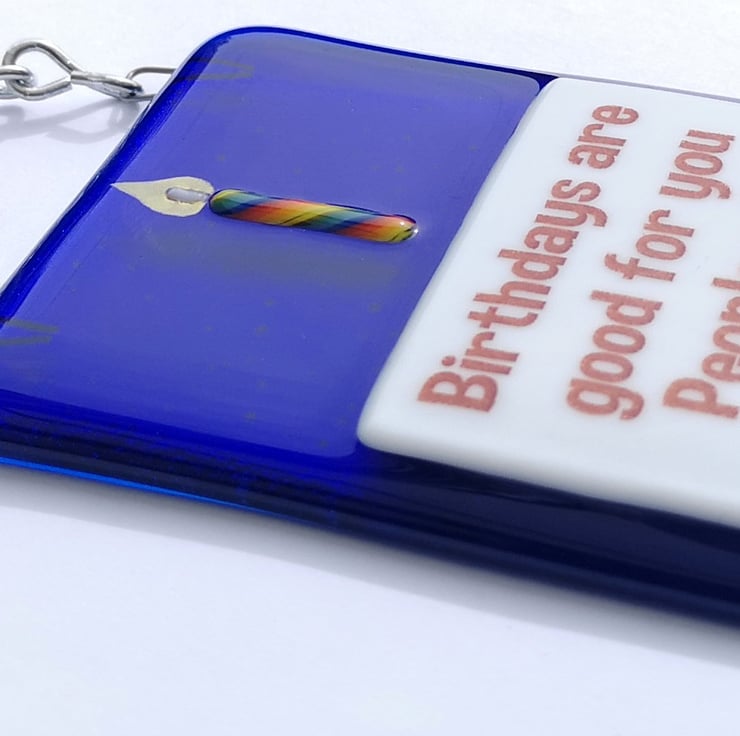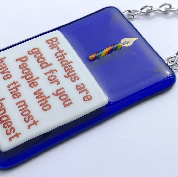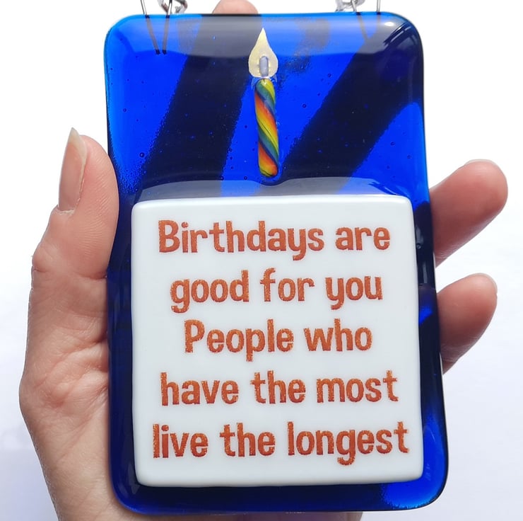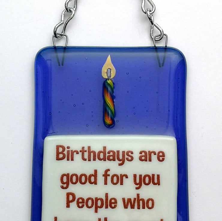 A 'Birthdays Are Good For You. People Who Have The Most Live The Longest' suncatcher hanging picture decoration, hung with chain.