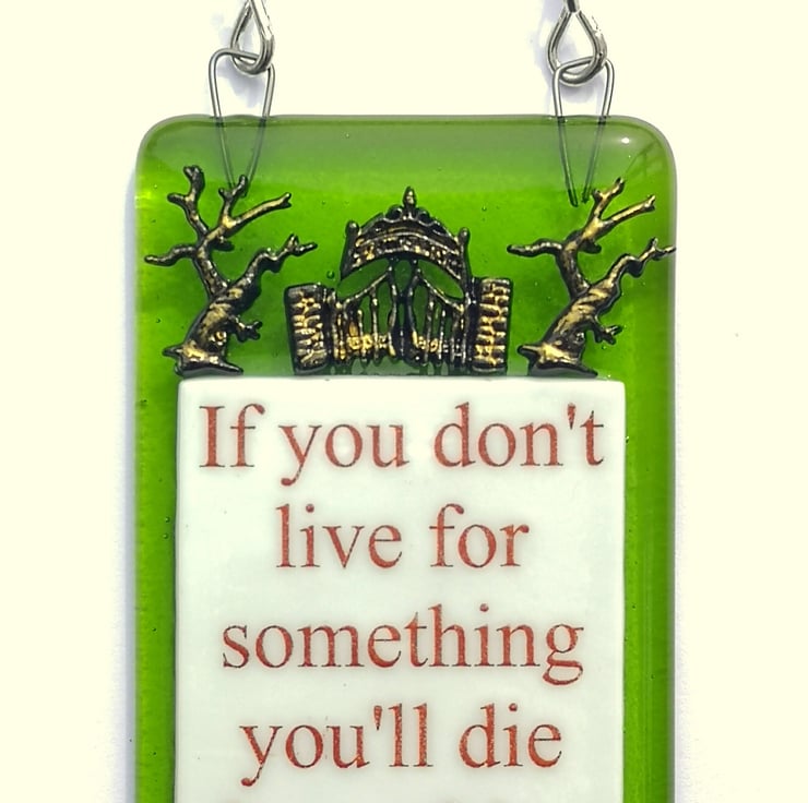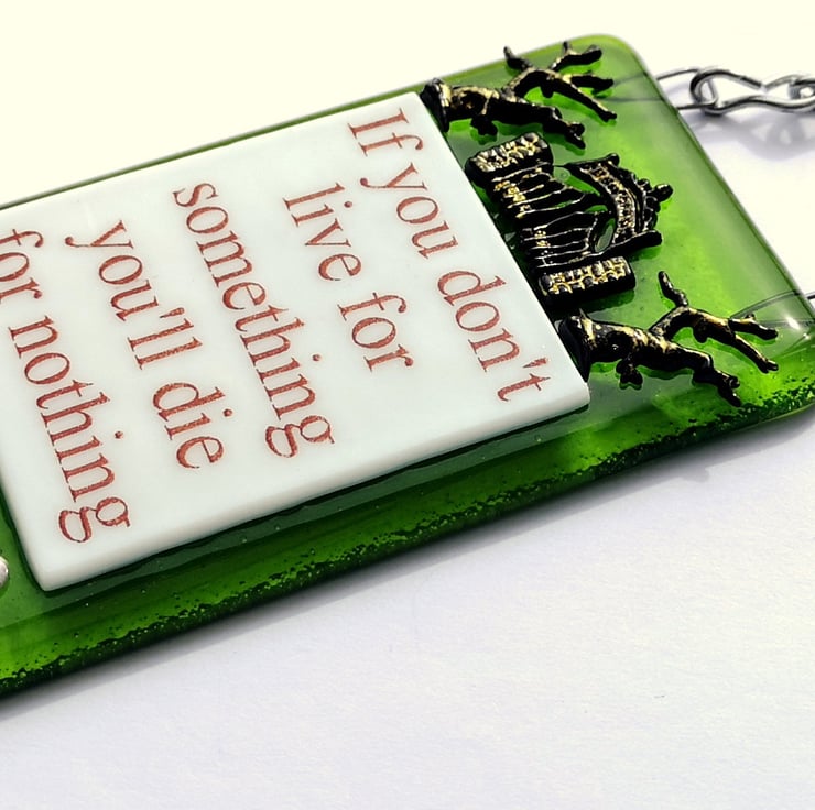 A 'If you don't live for something you'll die for nothing' suncatcher hanging picture decoration, hung with chain.