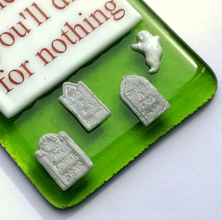 Handmade from glass that has been fused in a kiln, using only fully tested & compatible best quality art glass. The 3D ghost, gravestones, cemetery gates & trees are made from powdered glass which I turn into a clay. They are then permanently fused onto the glass base in a kiln.