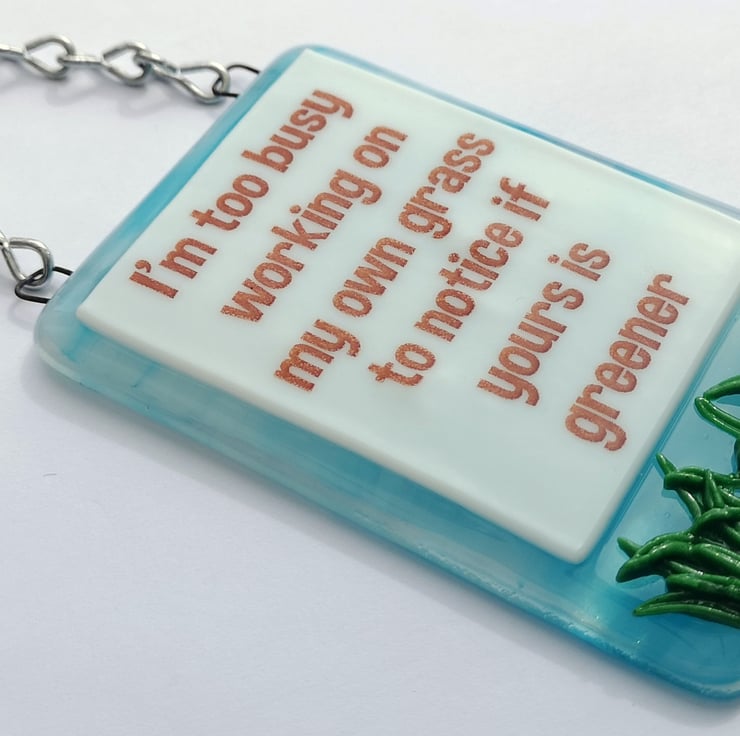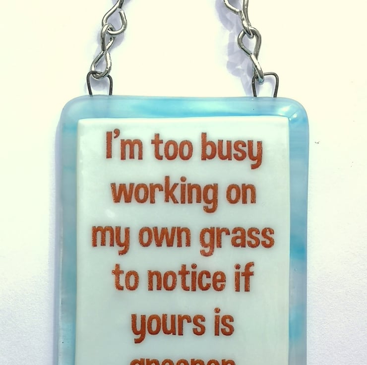 A 'I'm too busy working on my own grass to notice if yours is greener' suncatcher hanging picture decoration, hung with chain.