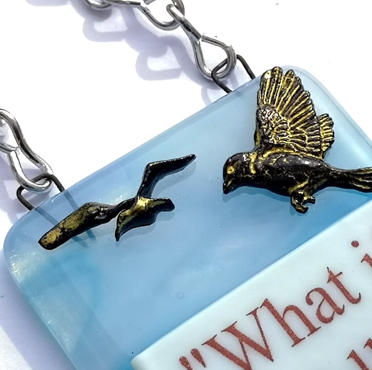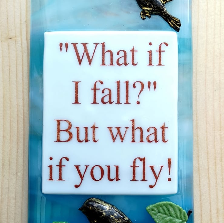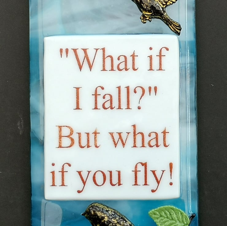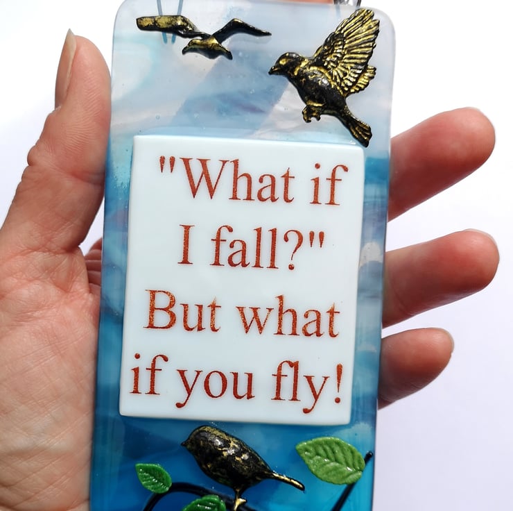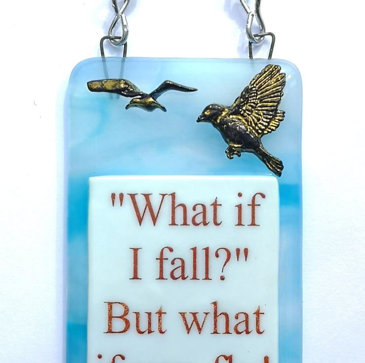 A 'What If I Fall? But What If You Fly!' suncatcher hanging picture decoration, hung with chain.