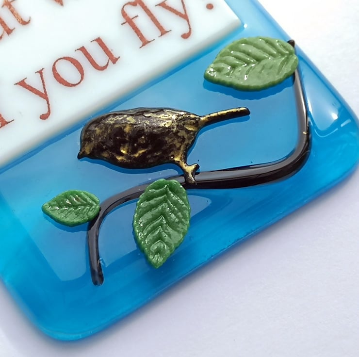 Handmade from glass that has been fused in a kiln, using only fully tested & compatible best quality art glass. The 3D birds and leaves are made from powdered glass which I turn into a clay. They are then permanently fused onto the glass base in a kiln.