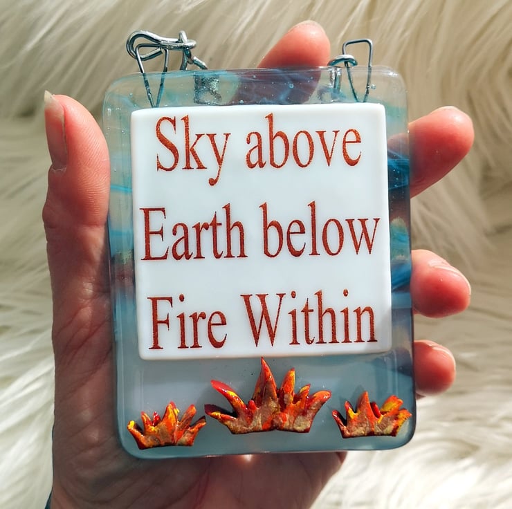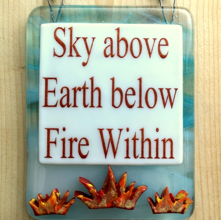 A 'Sky Above, Earth Below, Fire Within' Suncatcher Hanging Picture Decoration, hung with chain.
