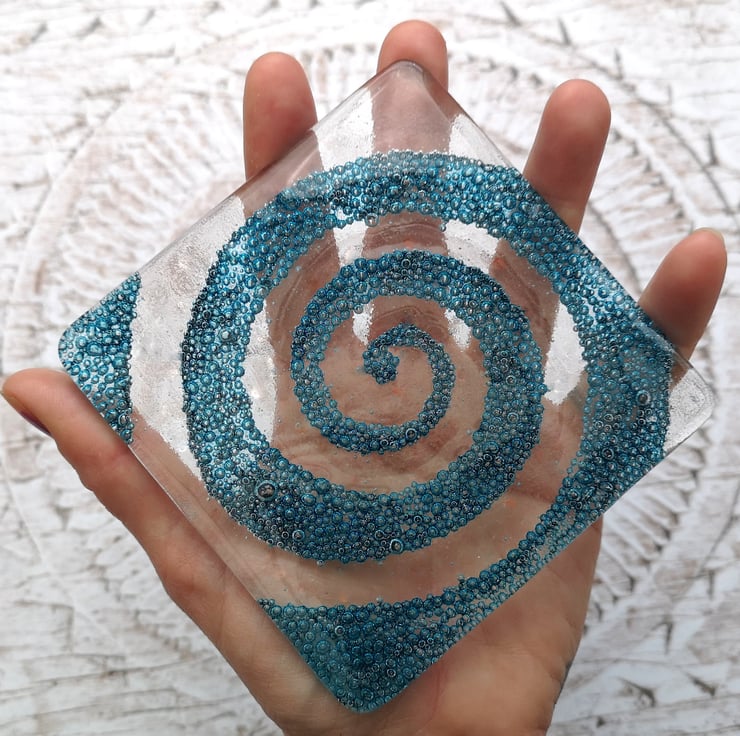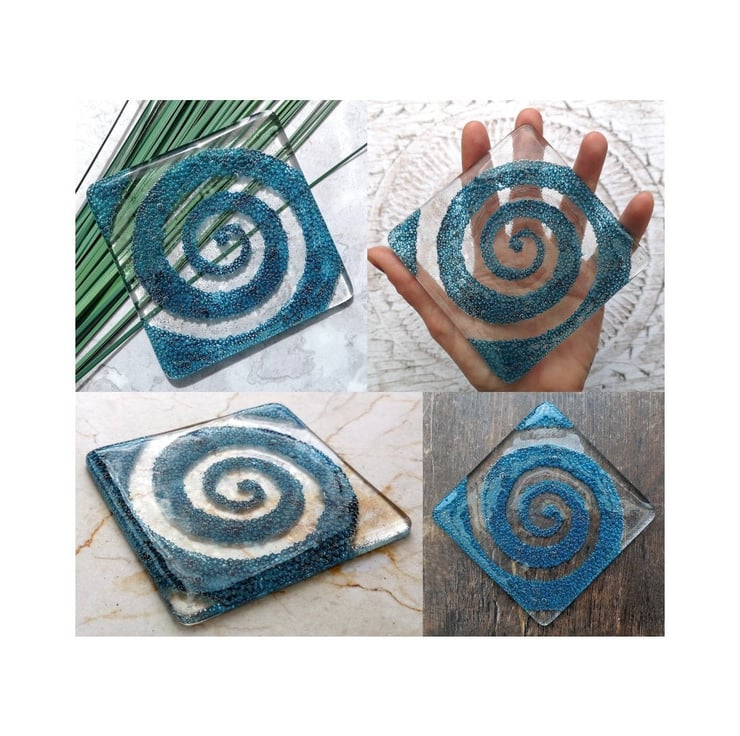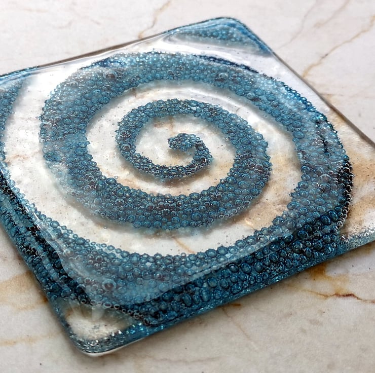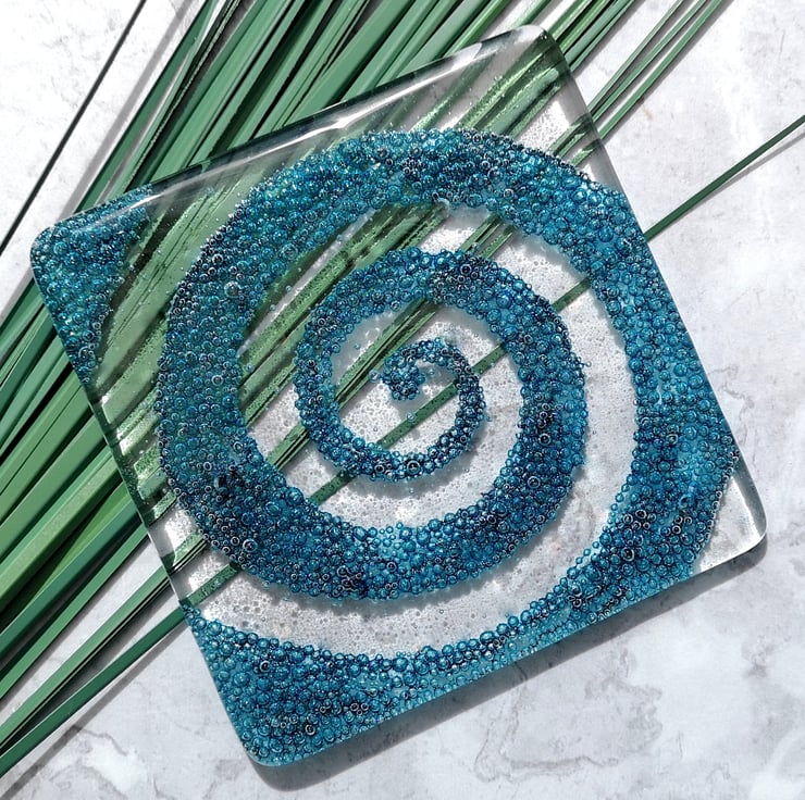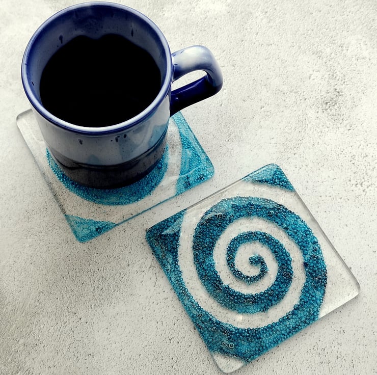 The coloured spiral is made by fusing Copper Oxide powder between the layers of glass. Once fired this powder creates lots of little blue coloured bubbles, safely embedded inside the coaster.