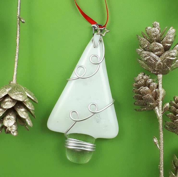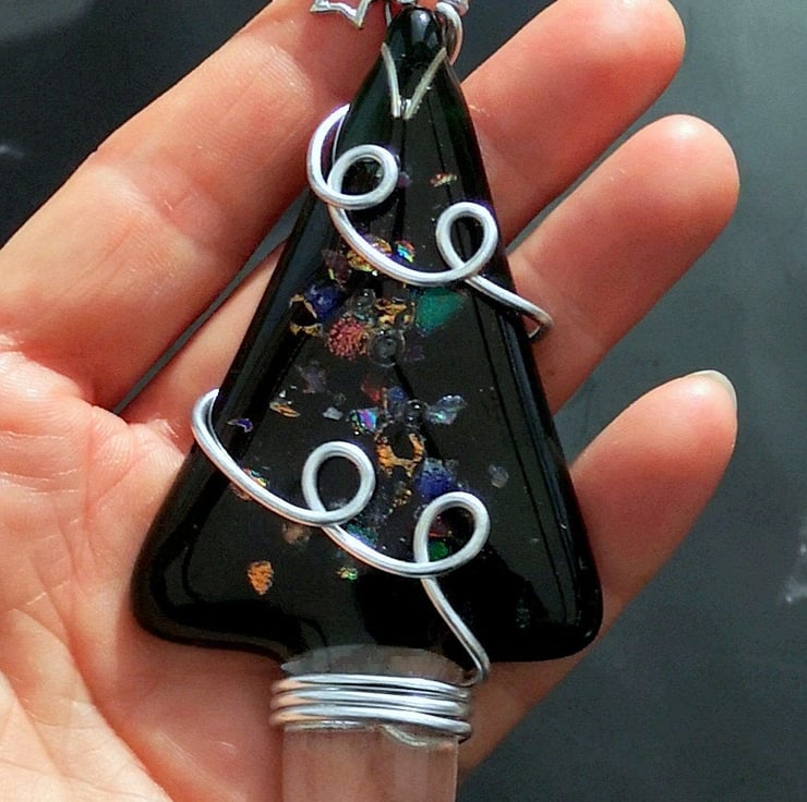 Triangular, wire wrapped, Christmas tree hanging decoration with dichroic glass flecks.