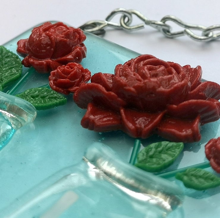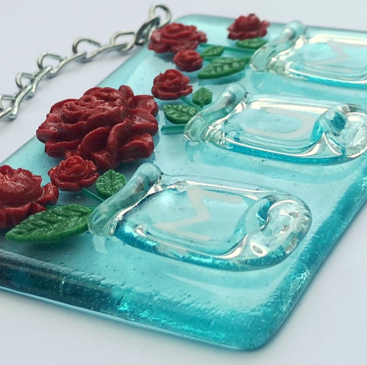 Handmade from glass that has been fused in a kiln, using only fully tested & compatible best quality art glass. The 3D flowers & leaves are made from powdered glass which I turn into a clay. They are then permanently fused onto the glass base in a kiln. The vases are made from little glass pots that have been melted flat.