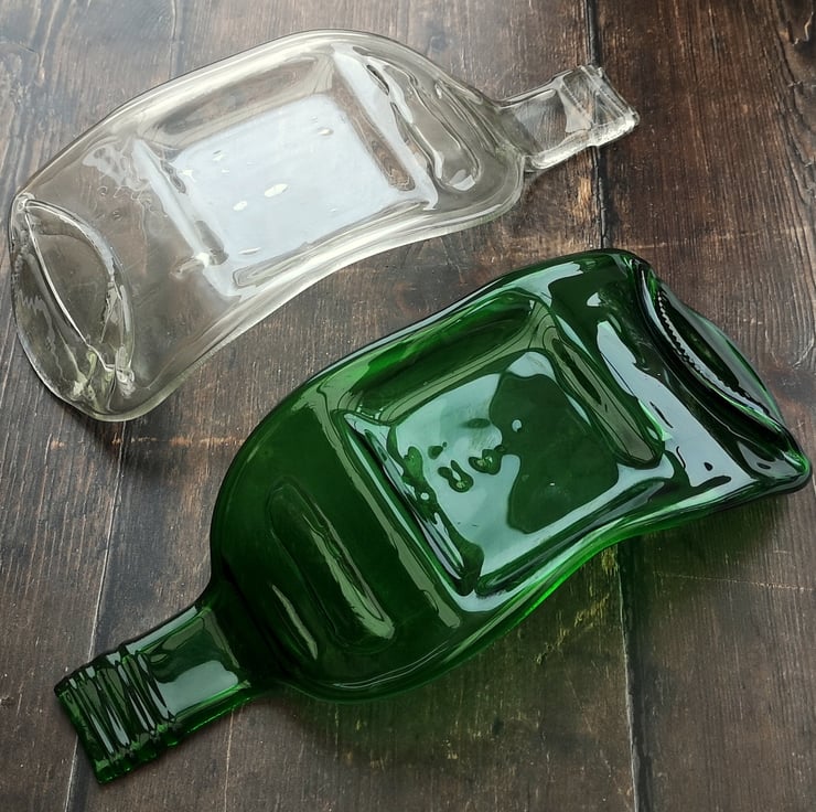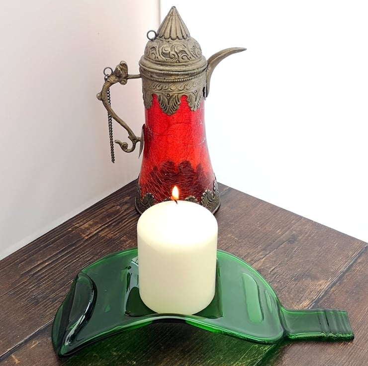 Squashed bottle, made from recycled glass that has been melted and slumped into a candle holder. A perfect upcycling, zero waste eco gift reclaimed bottles transformed into environmentally friendly tableware.