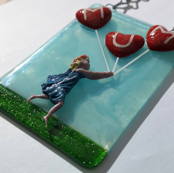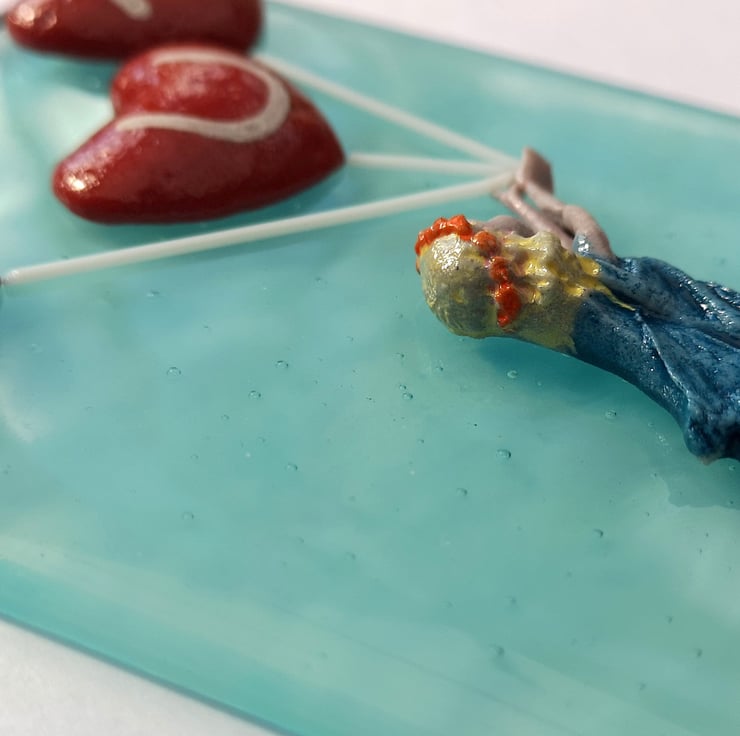 Handmade from glass that has been fused in a kiln, using only fully tested & compatible best quality art glass. The 3D parts are made from powdered glass which I turn into a clay. They are then permanently fused onto the glass base in a kiln.