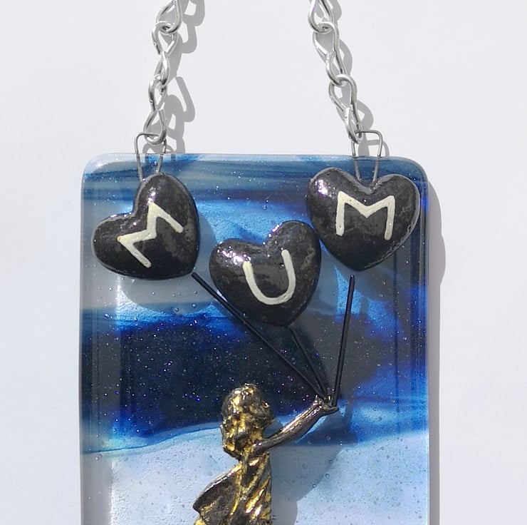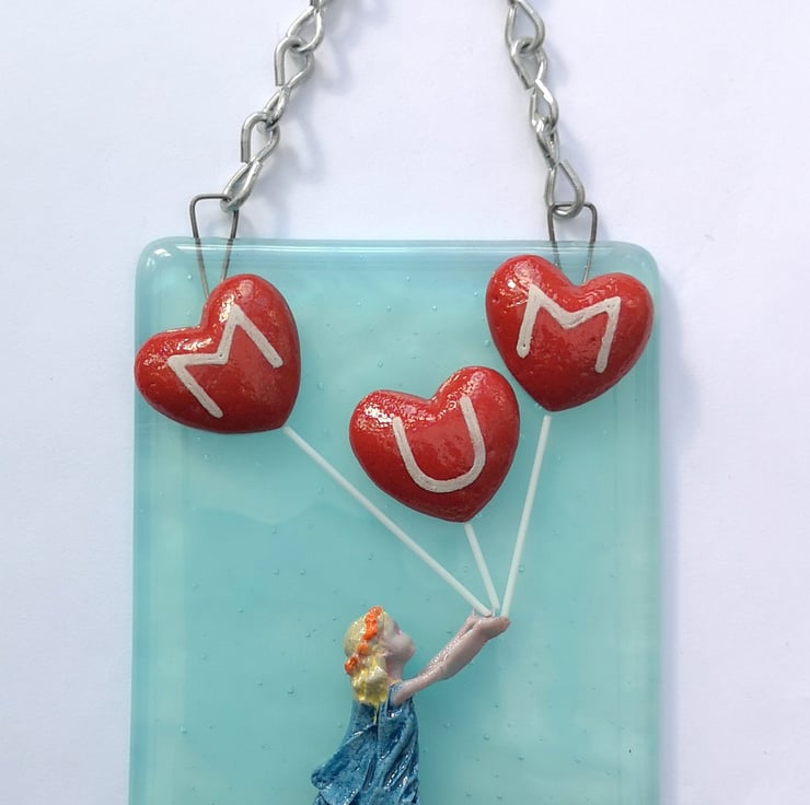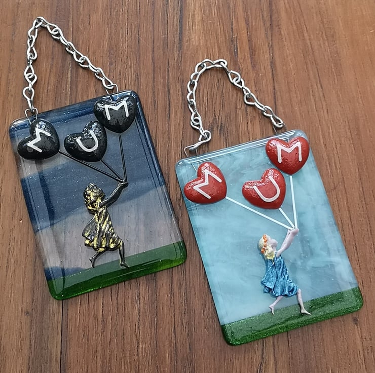 A 'Girl with Mum Heart Balloons' Hanging Picture, hung with chain.