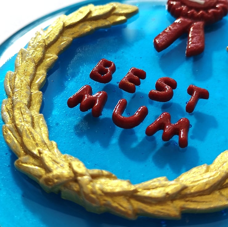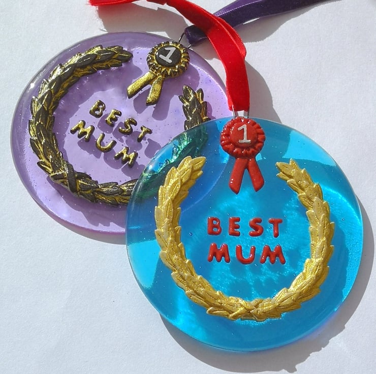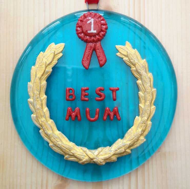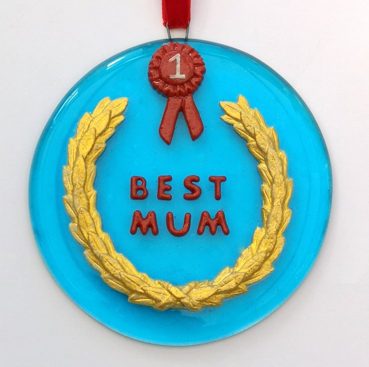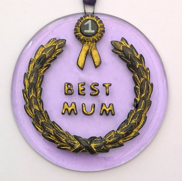 A 'Best Mum' Award Suncatcher Picture Decoration, hung with velvet ribbon.