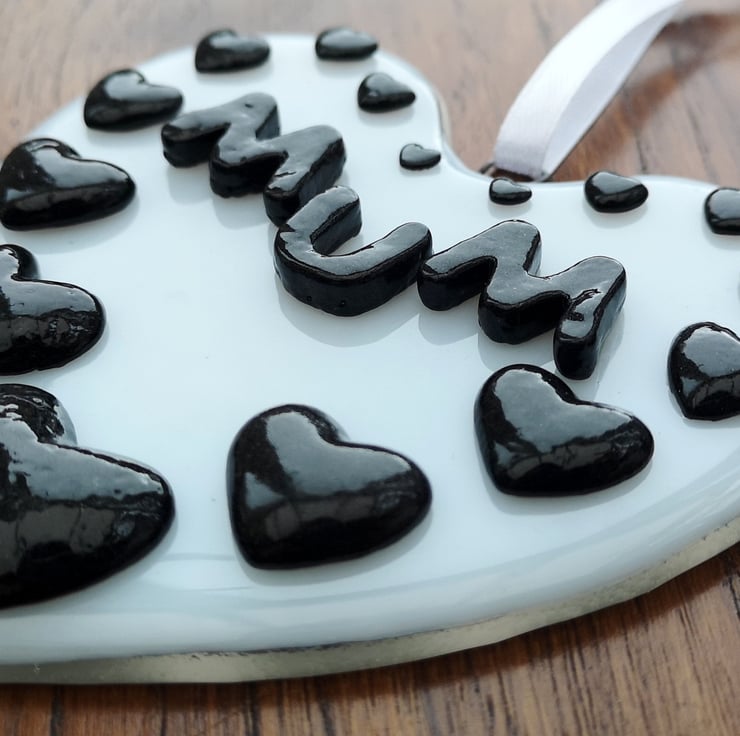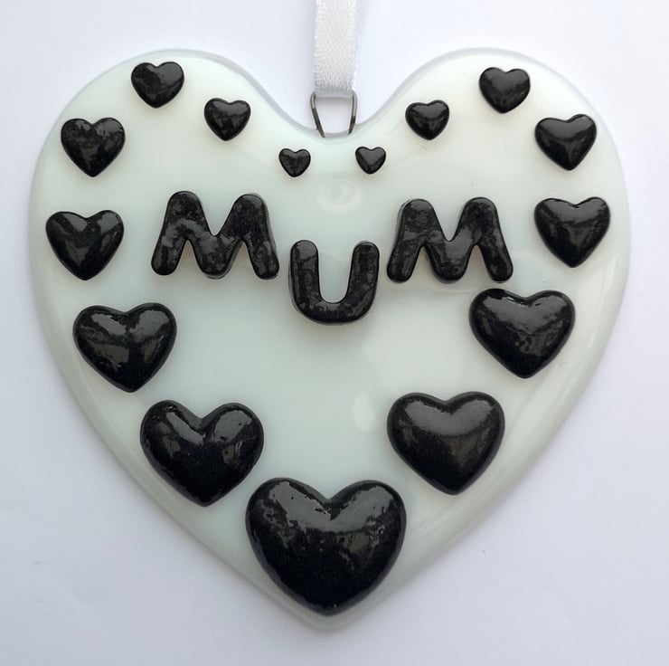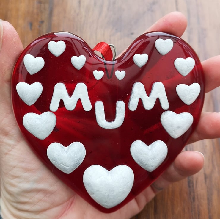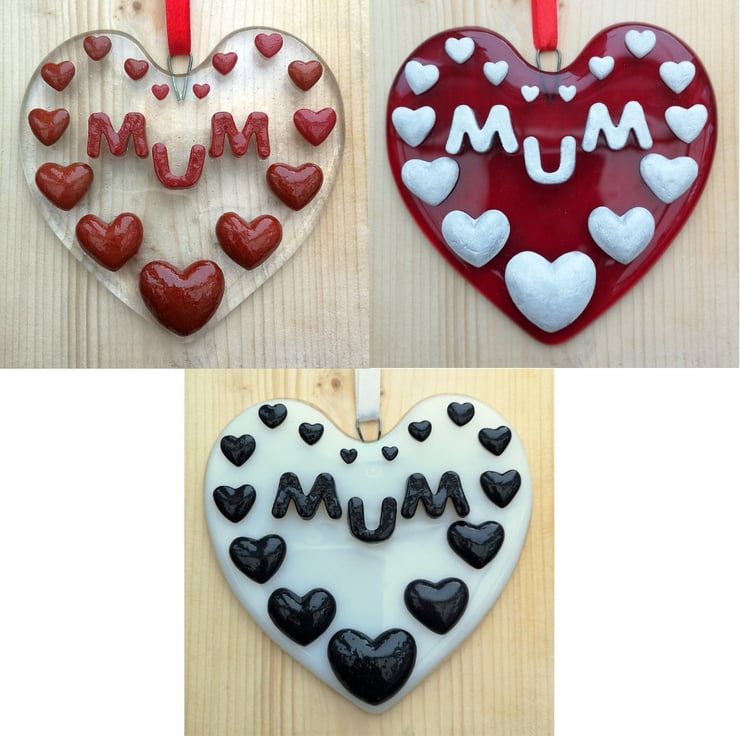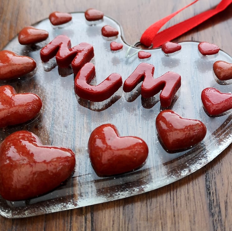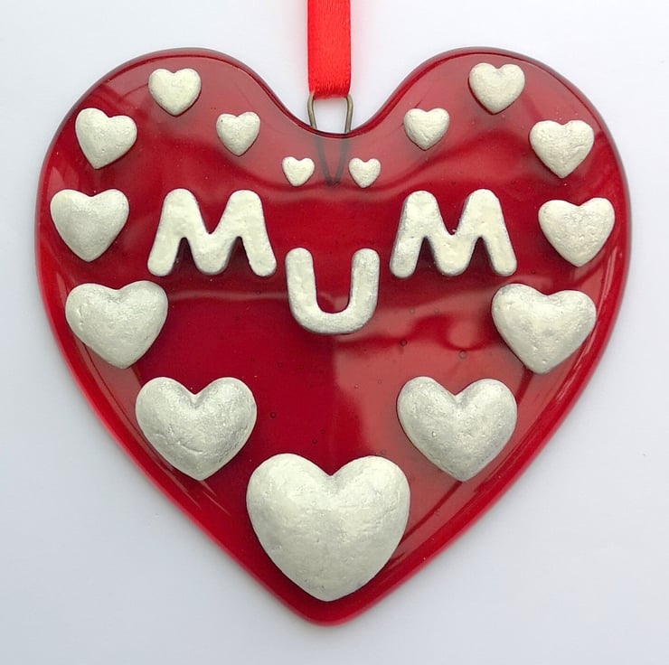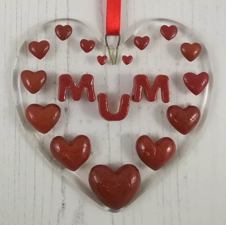 A 'Mum' Hanging Love Heart Suncatcher Picture Decoration, hung with satin ribbon.