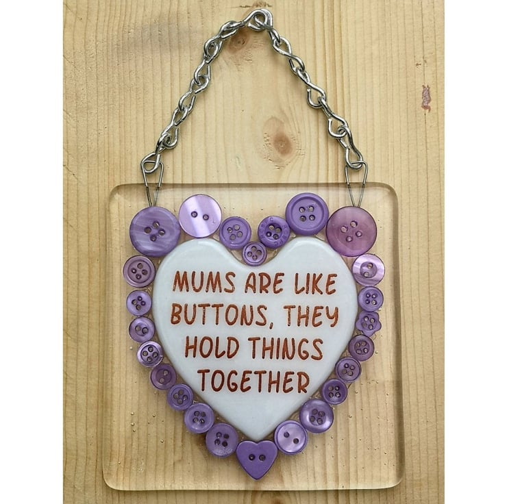 A 'Mums Are Like Buttons, They Hold Things Together' Hanging Heart Decoration, hung with ribbon or chain. Handmade from glass that has been fused in a kiln, using only fully tested & compatible best quality art glass.