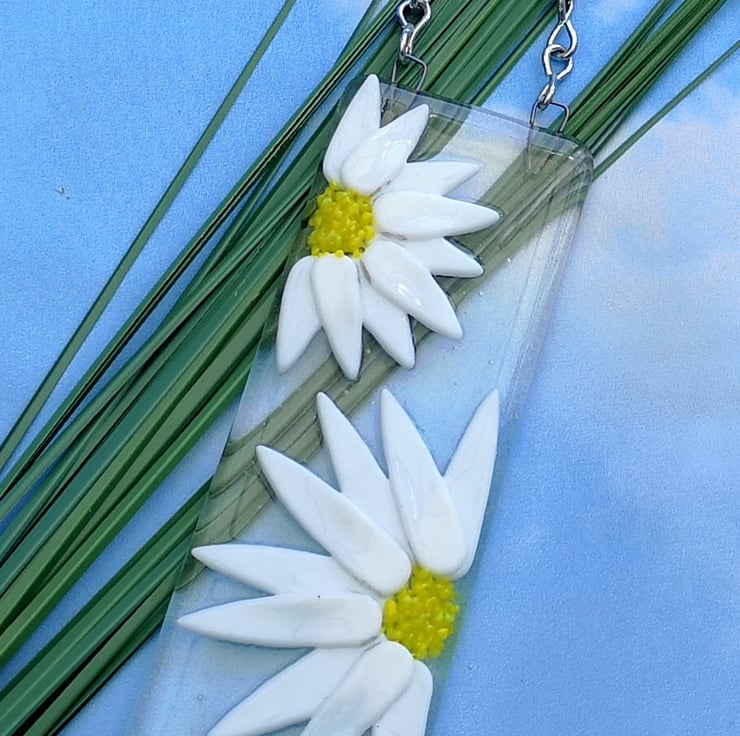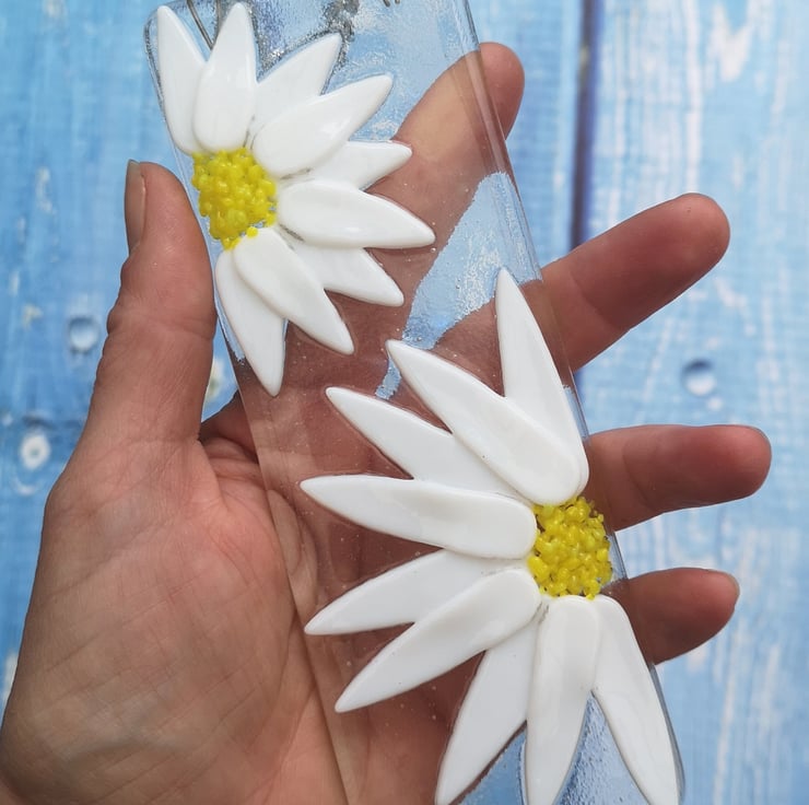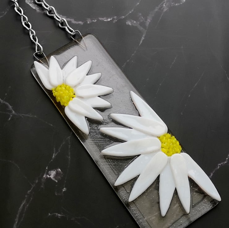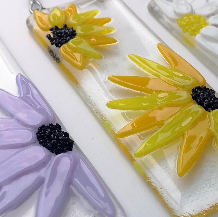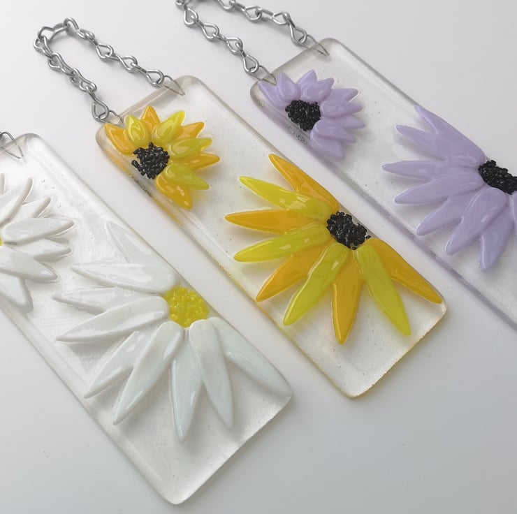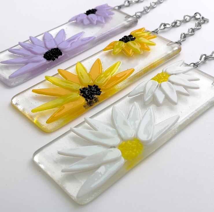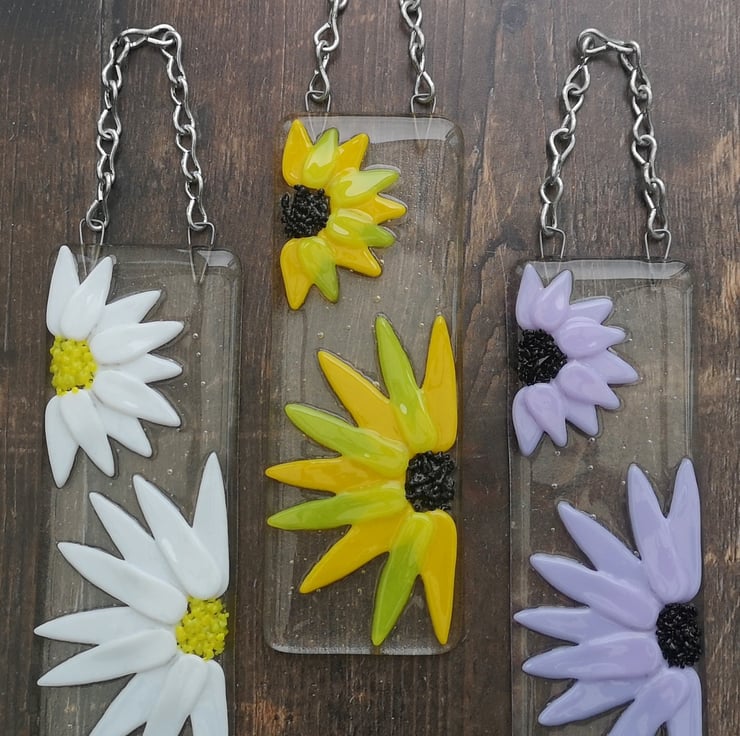 A smaller sized (please see my shop for a larger version) Daisy, Sunflower or other coloured flower hanging picture. Handmade from glass that has been fused in a kiln, using only fully tested compatible best quality art glass. The glass flowers are 3D and each petal is individually cut and ground down to a smooth shape. The picture is hung on a chain which has been permanently fused into the glass.