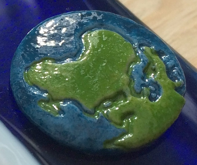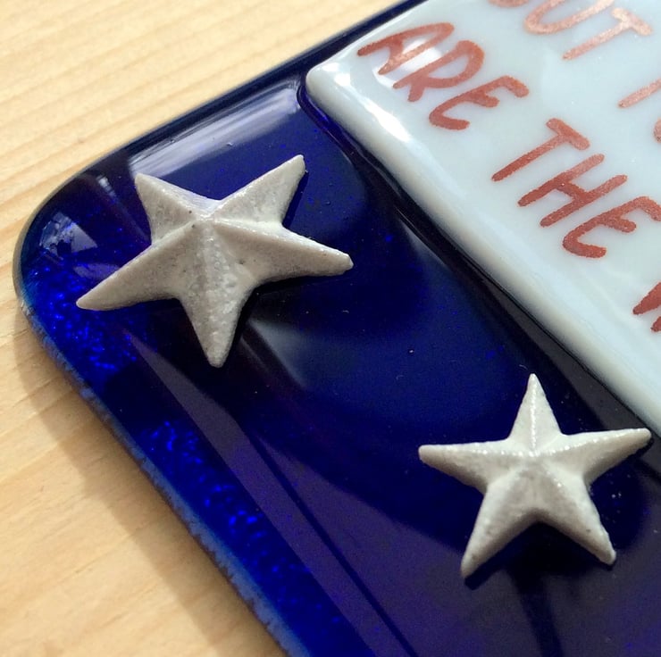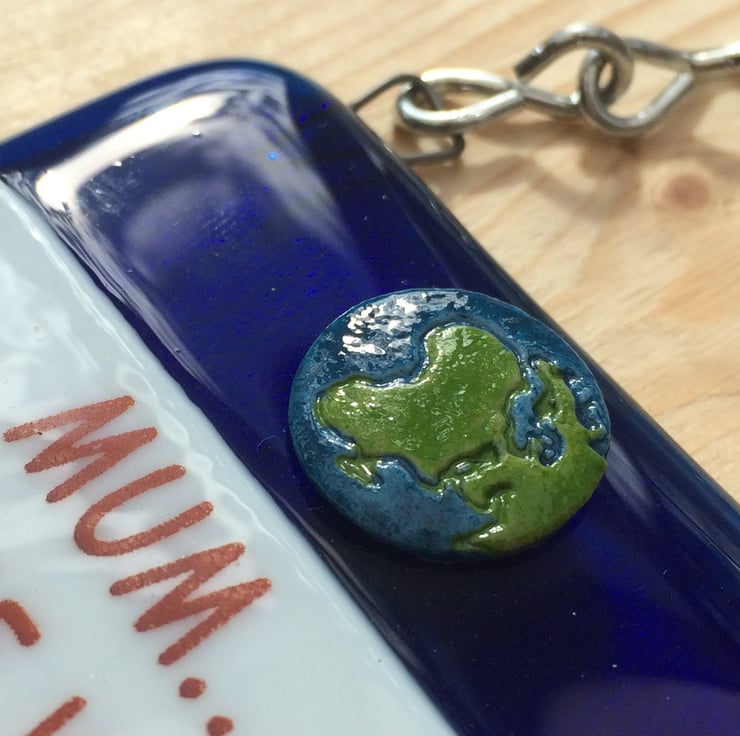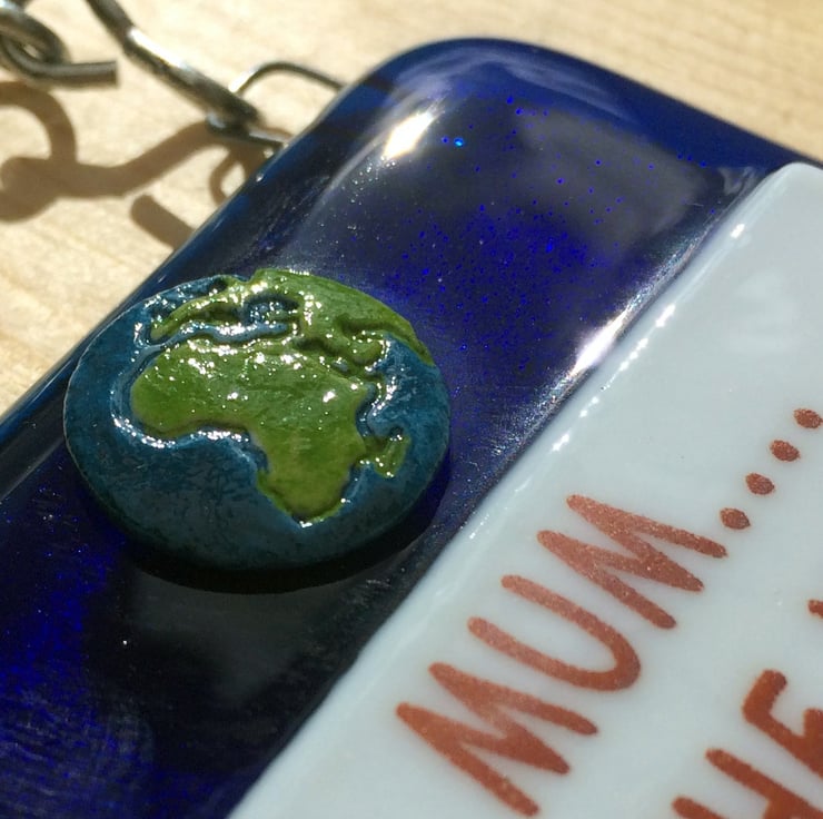 Handmade from glass that has been fused in a kiln, using only fully tested & compatible best quality art glass. The 3D world & stars are made from powdered glass which I turn into a clay. They are then permanently fused onto the glass base in a kiln.