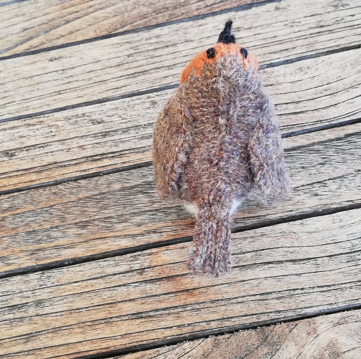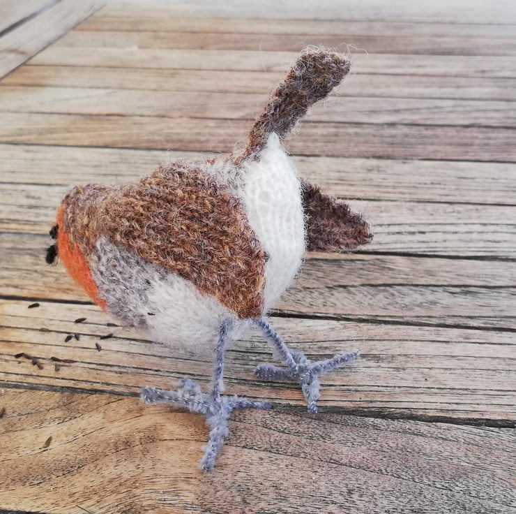 In the very early morning when I am digging in my tiny allotment behind our garden a Robin frequently joins me waiting for the worms I am turning up to take to her nest. I have knitted several Robins but observing her inspired me to set about trying to create a robin reflected her movements shape and colouring.