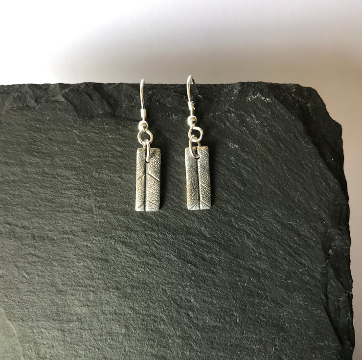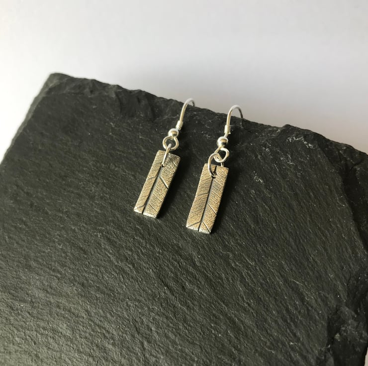 This pair of fine silver earrings feature a leaf imprint design in rectangular shape. They measure 1.5cm x 0.5cm and are attached to the ear with sterling silver ear hook.