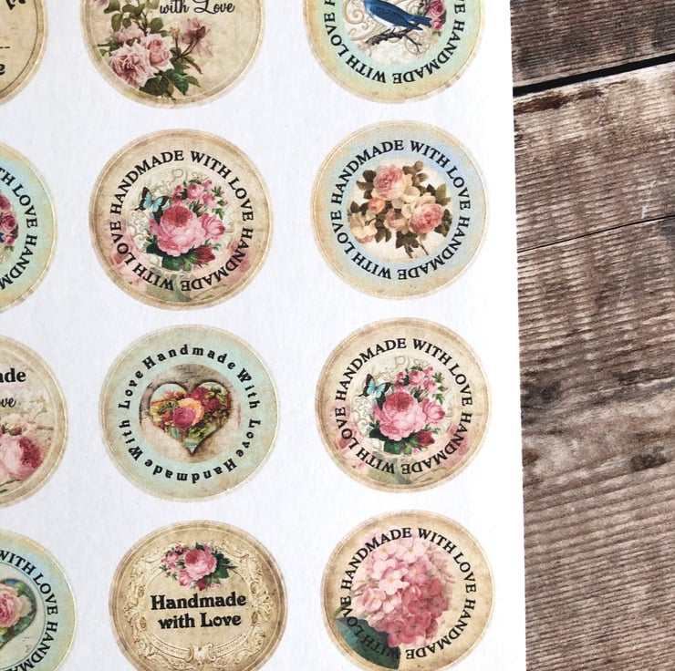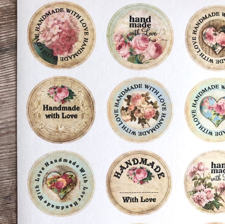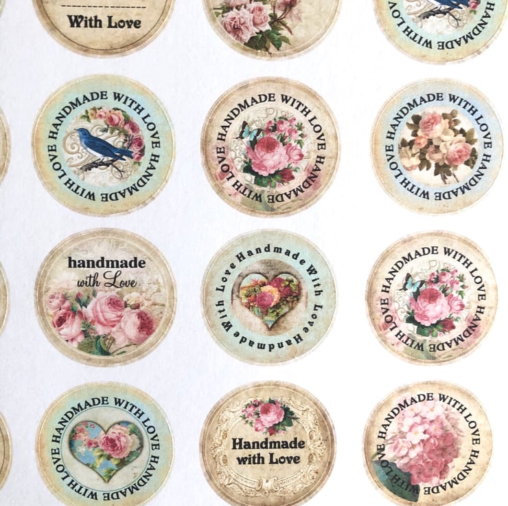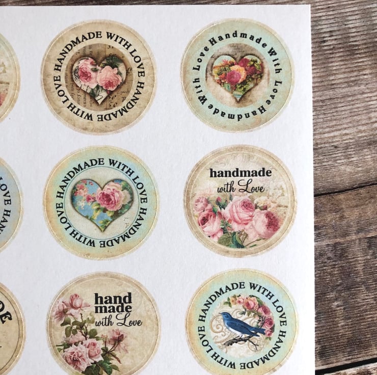 Sheet of 24 x Handmade with love stickers .. circle shaped and all different patterns
