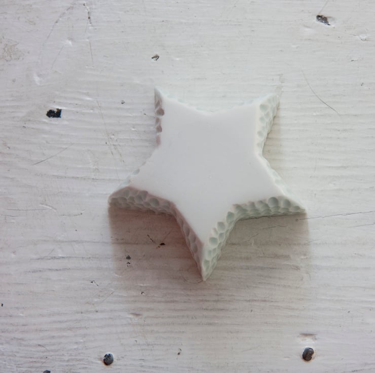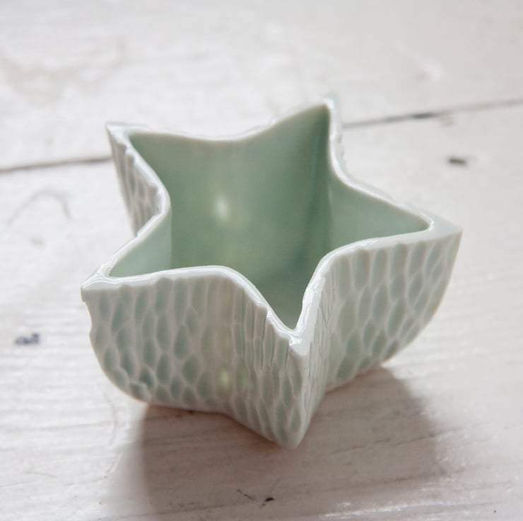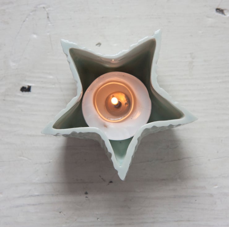 I make this star tealight holder. I carve each one of these, and the nature of porcelain means that the candle light is diffused through the carvings. This is a particularly difficult shape to make and is more prone to failure, which makes each one even more special when it survives the firings!