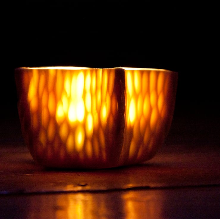 I started making vases, and carving their surface. I love to work outside and as I worked with them, I saw the the light was shining through the carvings, and started working on the idea of tea light holders.
