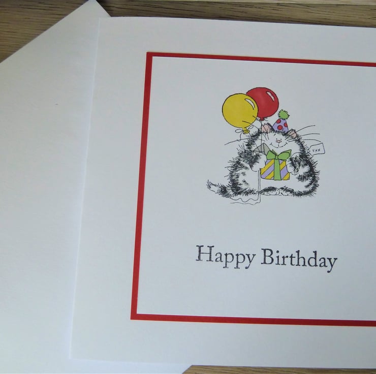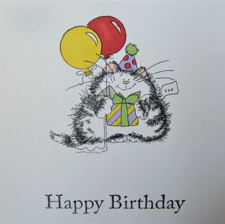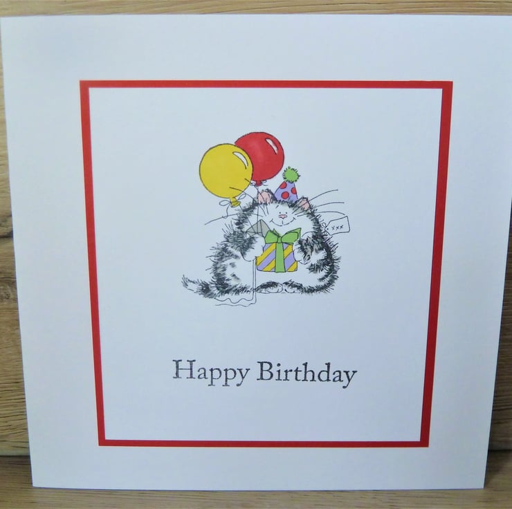 A card which features a hand stamped image of a cat holding a present and some balloons, it has been hand coloured.