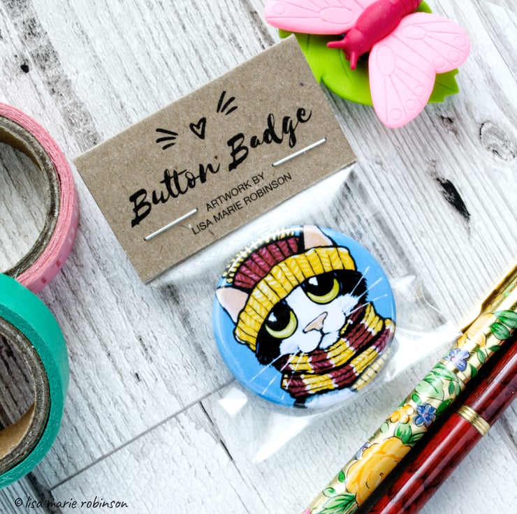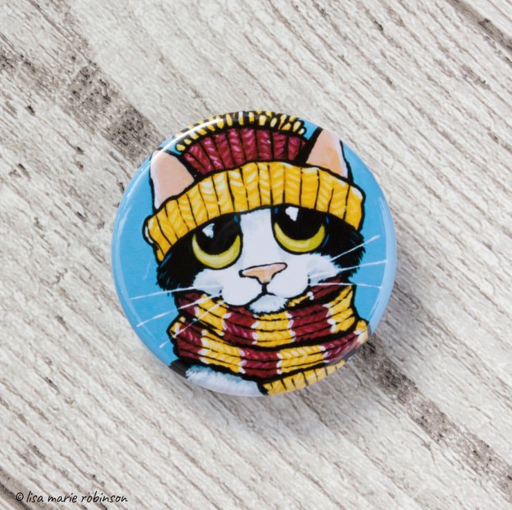 Cat button badge featuring a painting of a black & white cat wrapped up for winter. He looks warm and toasty in his matching yellow & red scarf and hat!