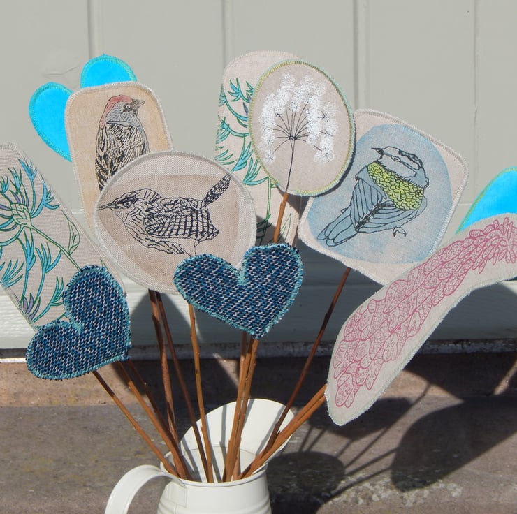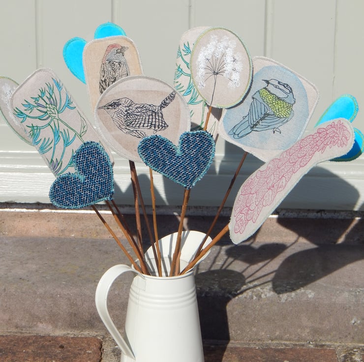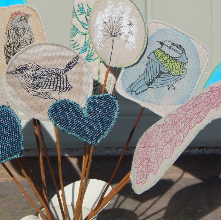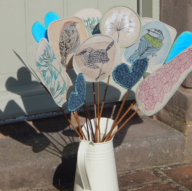 This is a bouquet of 12 fabric on willow creations. Each is double sided with interfacing for stability. They are all have running stitch and then a zig zig stitched finishing to ensure fraying is kept to a minimum. They are then hand glued onto willow which measures about 40 cm in length.