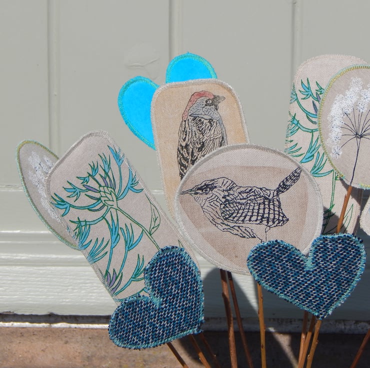 There is 1 blue tit, 1 sparrow and 1 wren. The birds are screen printed on top of a simple lino print and then the sparrow and blue tit are hand painted to give them a little colour. There are 2 wild cornflower panels, screen printed and hand painted. There are 2 achillea, 1 foxglove and 4 blue hearts for a pop of colour.