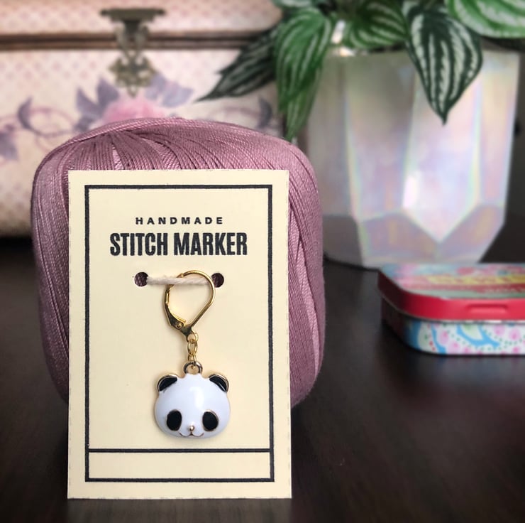 Enamel panda face stitch marker for knitting or crochet, with gold plated findings. You can choose either a lobster claw clasp (as in cover photo) or a larger lever back clasp (second photo) depending on your personal preference. The charm is hollow and light weight.