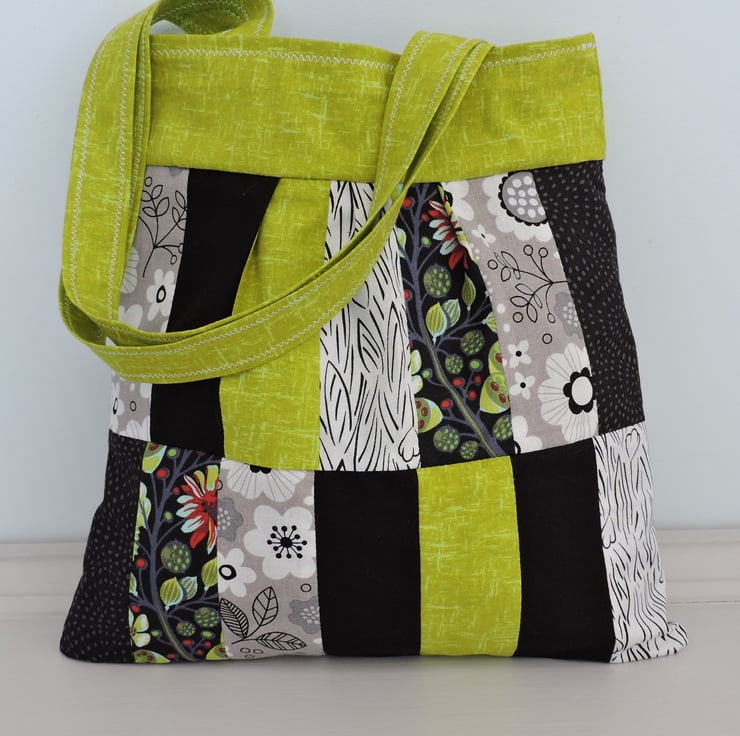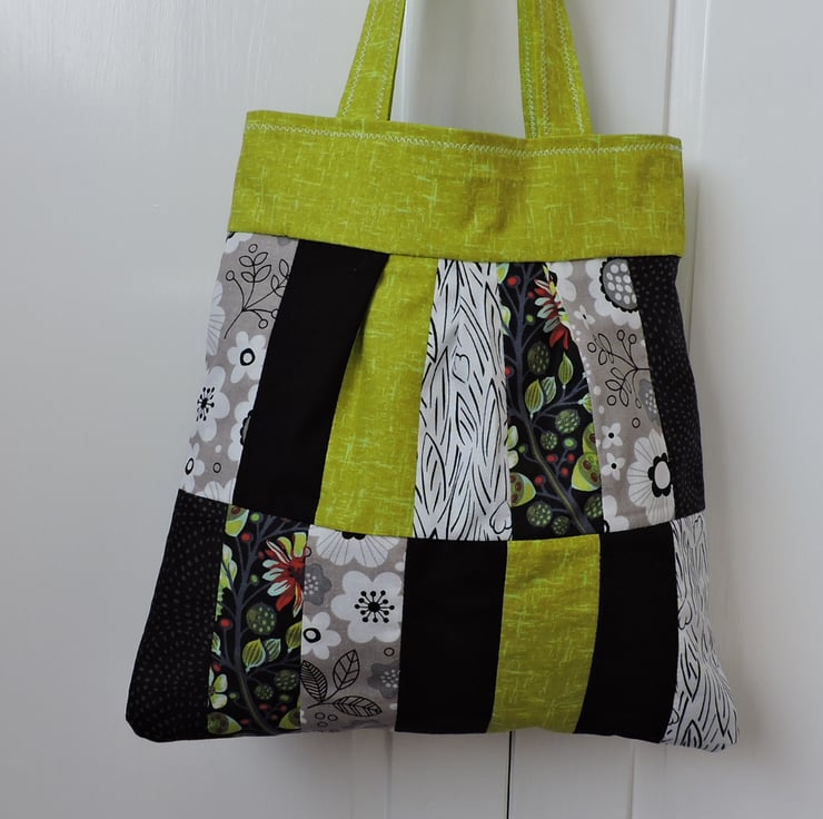 50% off Sale was £12.00 now £6.00 This pleated patchwork handbag, tote bag, has been made with an assortment of cotton fabrics. Floral, plain, and random patterns in black, white and lime green with a smattering of red. It is fully lined with plain dark grey cotton fabric. This bag folds easily to fit in a pocket, bag or suitcase making it the perfect resuable tote bag.