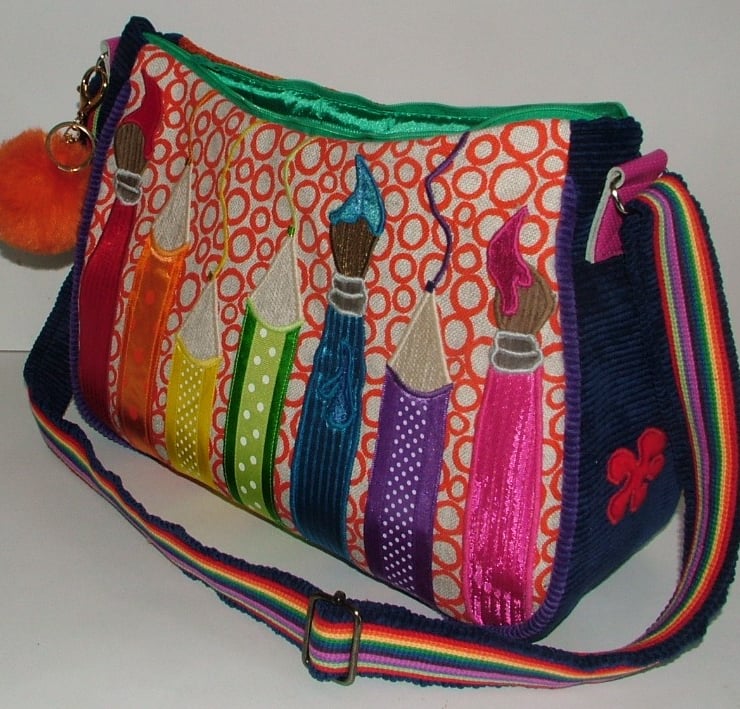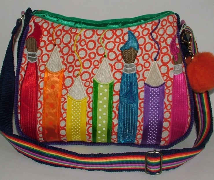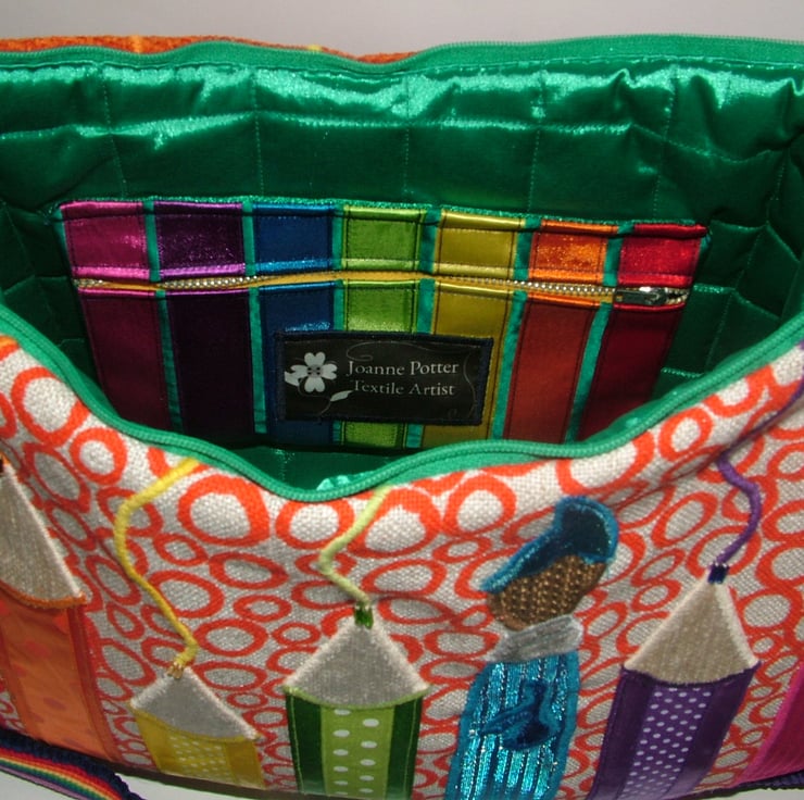 The front is a really fun orange and cream hoop linen fabric, which I have overlaid with 4 ribbon pencils and 3 ribbon paintbrushes.
