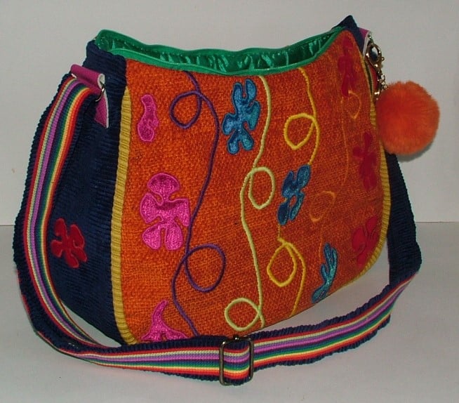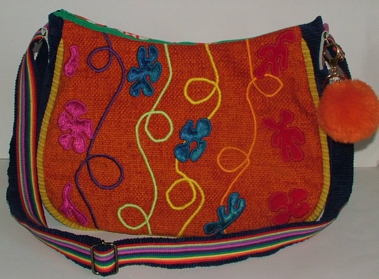 The back is a woven burnt Orange chenille fabric that has purple, green, yellow and orange zig-zag swirly stitching and padded velvet paint splats in pink, blue and red.