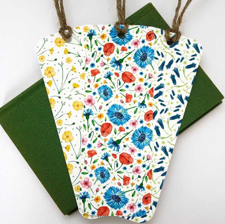 Set of three pretty patterned bookmarks, featuring my original watercolour meadow, buttercup and bluebell patterns.
