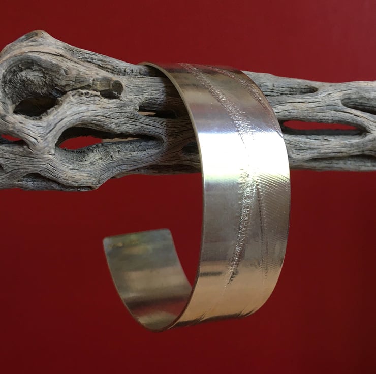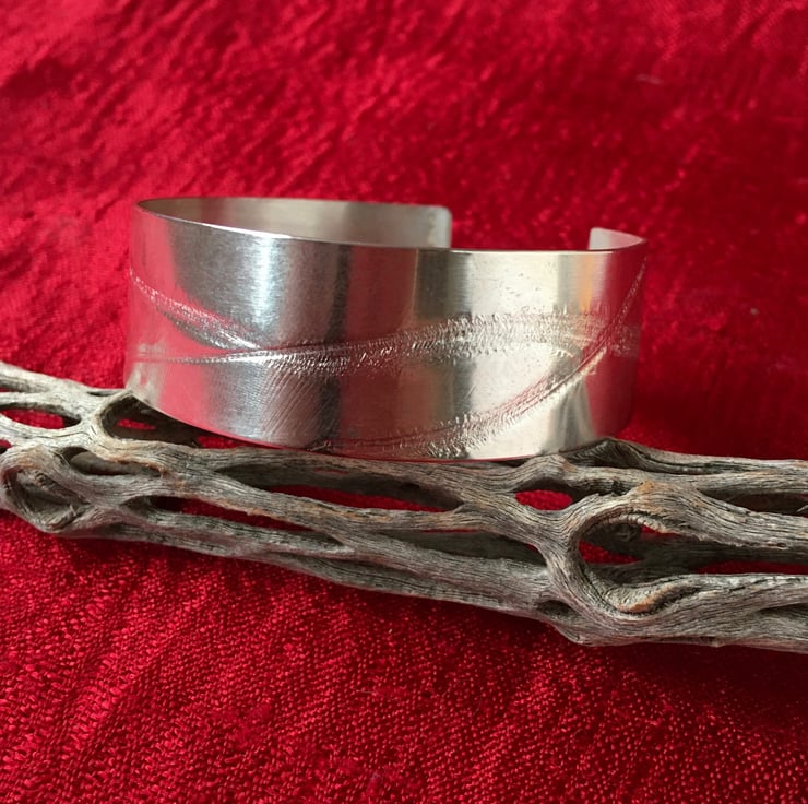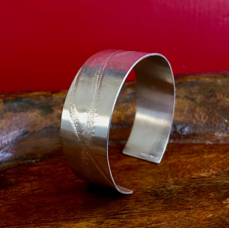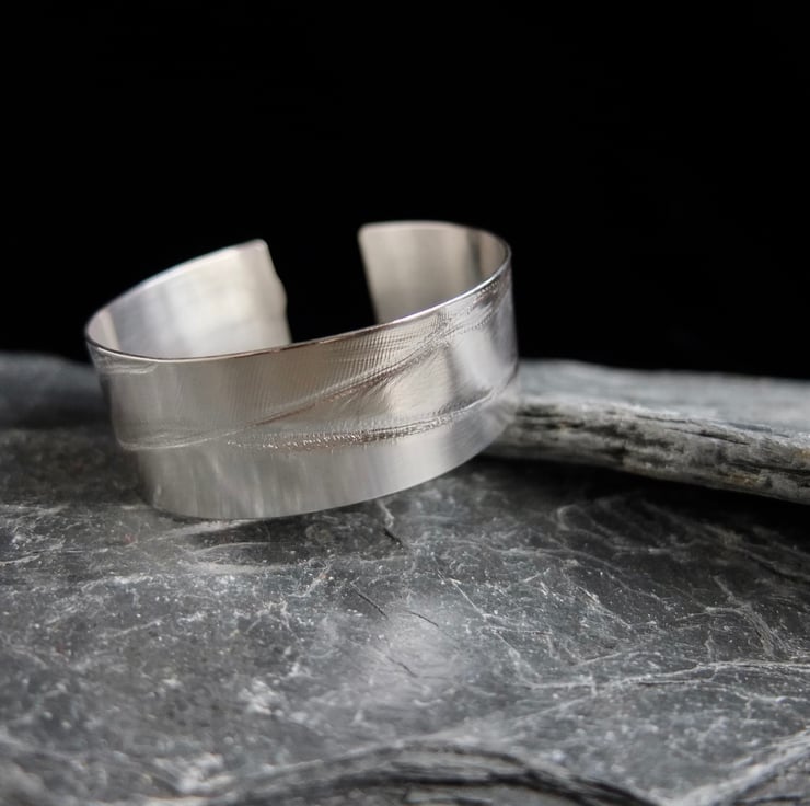 I have textured this sterling silver cuff with the imprint of several real feathers, which I layered together and then put through my rolling mill on top of the silver. This means that the pattern is deliberately random, showing the overlapping feather stems and vanes. I allowed parts of the feathers to extend out beyond the silver at one end, to make it asymmetrical.