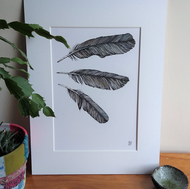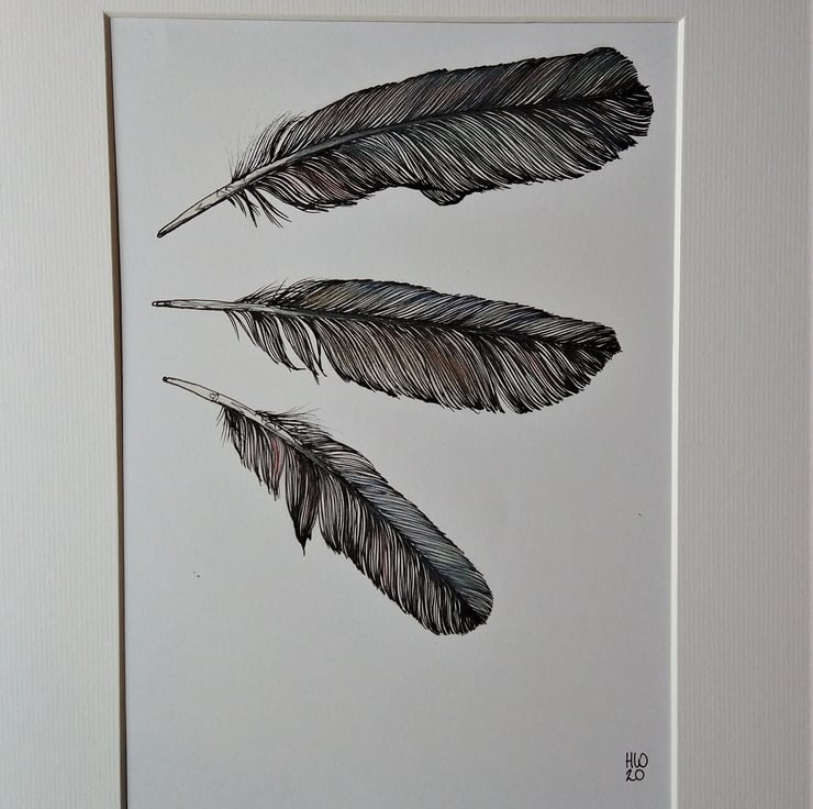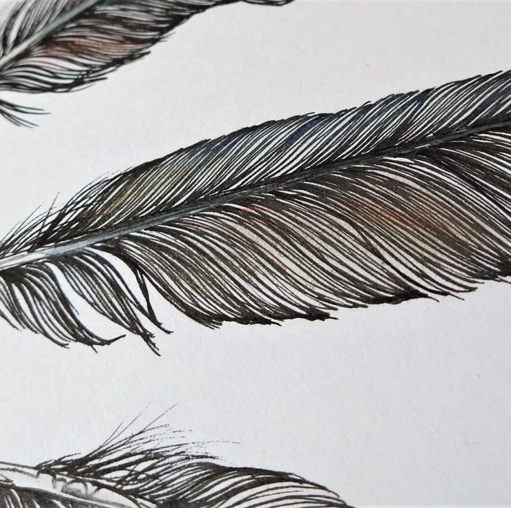 I spend a lot of time collecting and drawing feathers, I find them endlessly fascinating. This drawing is of three feathers found in the woods near my house. It's an original pen drawing with iridescent oil pastel worked over the top to capture the subtle shimmer of the feathers.