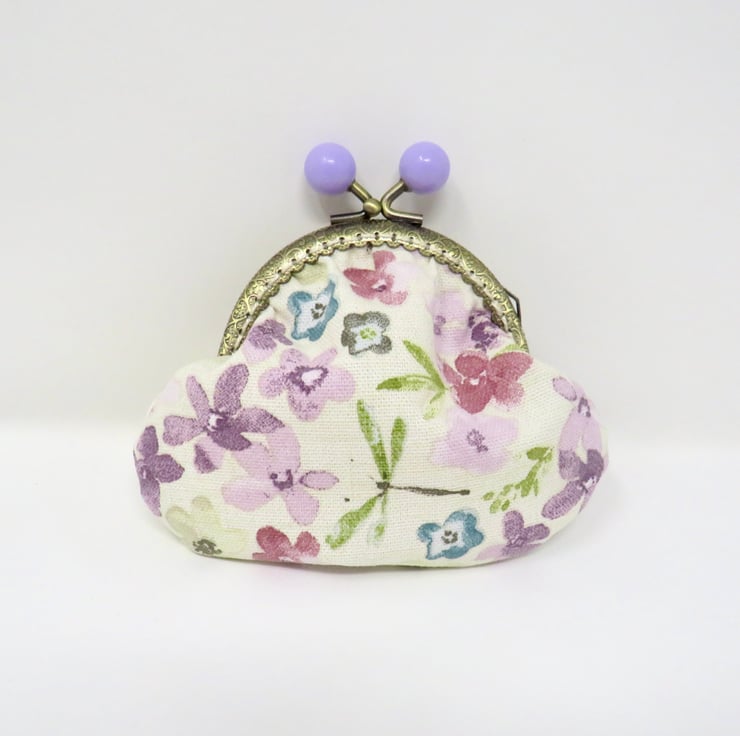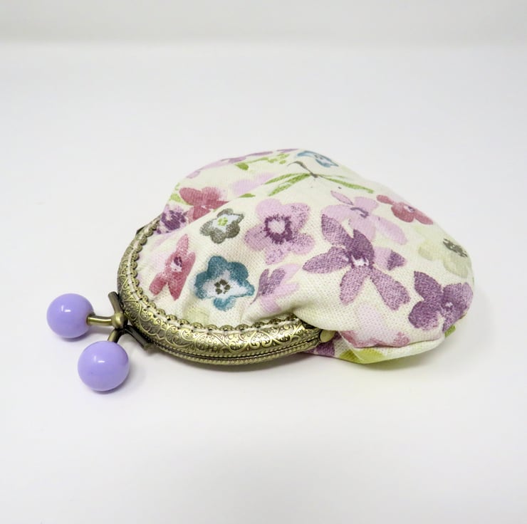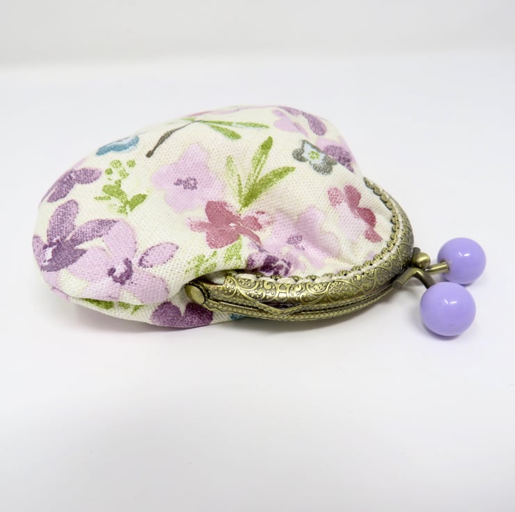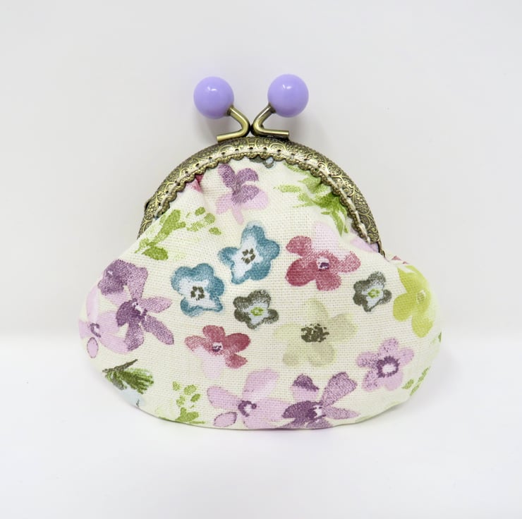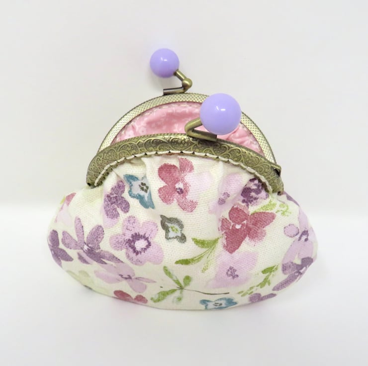 This pretty coin purse is made in a floral cotton print in shades of lilac, green, blue and pink, and lined in a pink and white ditsy print cotton. The purse has been glued into a curved bronze frame with a lilac bobble clasp and then sewn with toning thread. Perfectly sized for popping into your handbag.