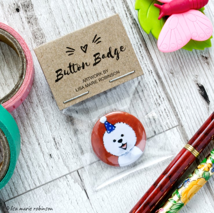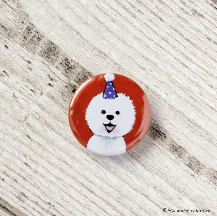 This cute little bichon frise button badge is perfect for a lucky bag for a dog themed kids party, or for someone who just loves dogs!