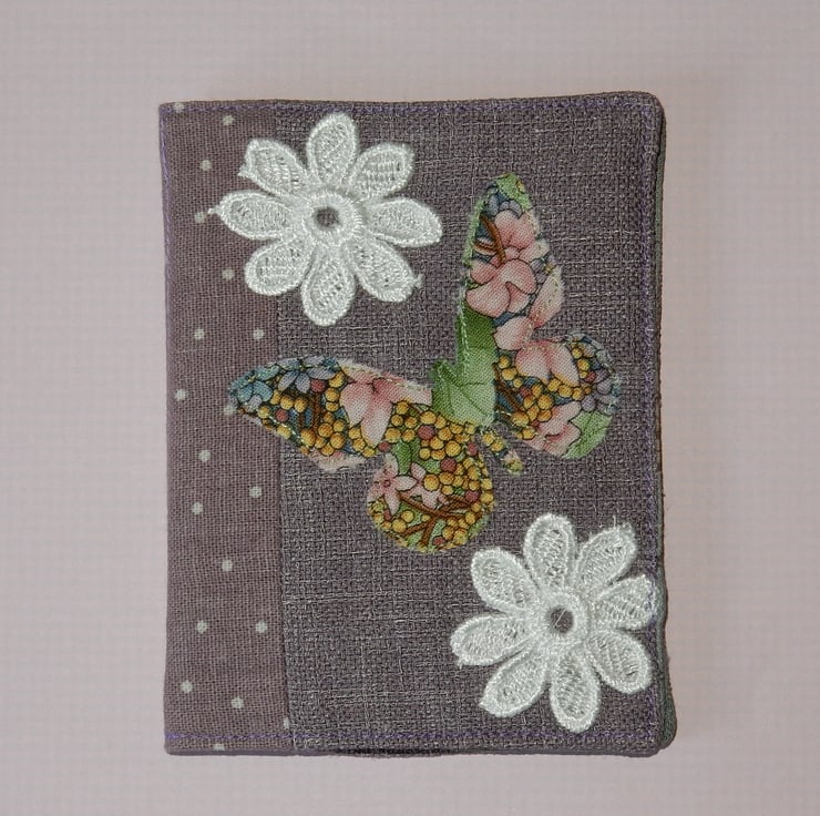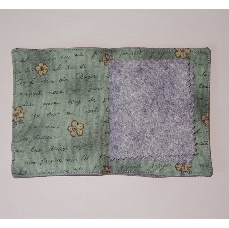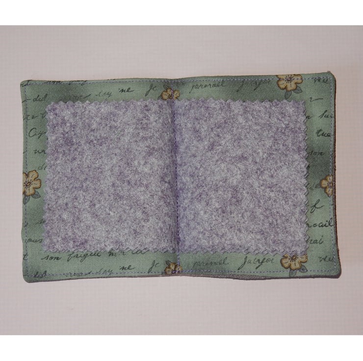 This is a very pretty needle case, featuring an applique butterfly and two lace flowers on a plain lilac woven fabric, with a matching spot print fabric on the spine. It measures approx. 4.5 x 3 inches. It is lined in toning cotton fabric and has four good quality felt leaves for your pins and needles.