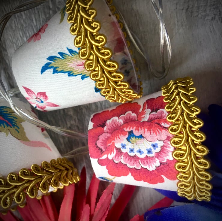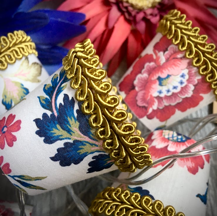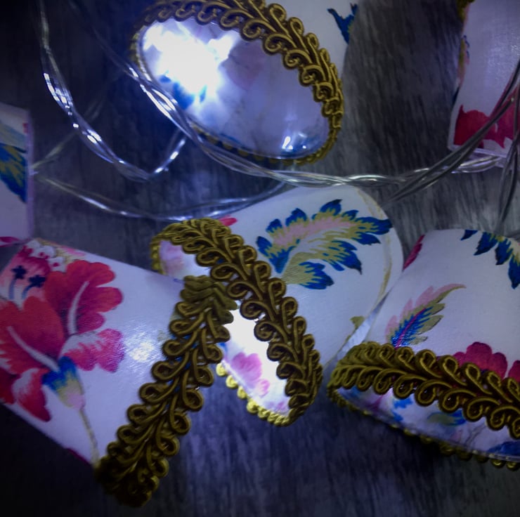 These mini lampshades are perfect to drape along a mantlepiece or shelf, around the head of a bed, or strung across a mirror or picture frame.