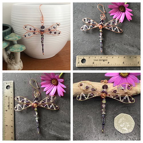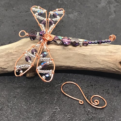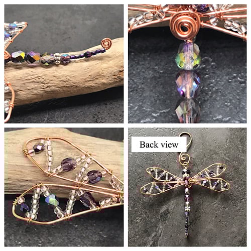 I have created this unique dragonfly with copper wire using wire wrapping techniques. The dragonfly shape is gently hammered to strengthen, I have then threaded and wrapped beautiful sparkling fire pollished crystals, silver lined crystal and iridescent seed beads on and around the shape with copper wire. A handcrafted copper hook is attached for hanging.