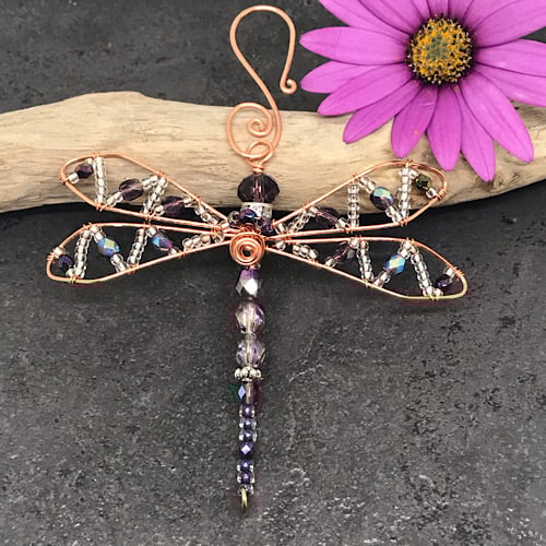 A purple dragonfly hanging decoration handcrafted with copper wire and Beautiful purple crystal beads and seed beads.