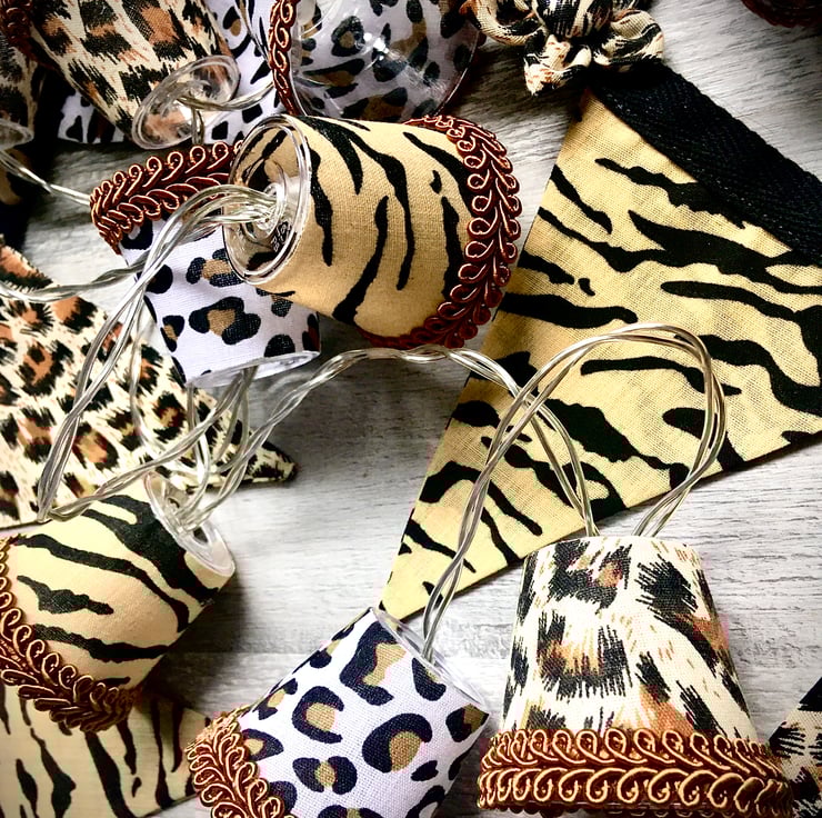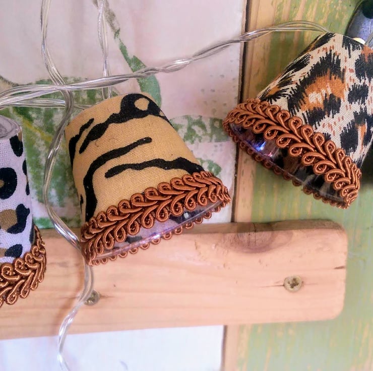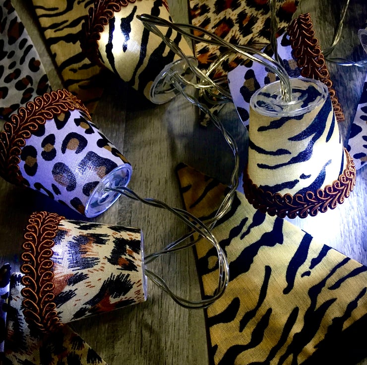 These mini lampshades are perfect to drape along a mantlepiece or shelf, around the head of a bed, or strung across a mirror or picture frame.