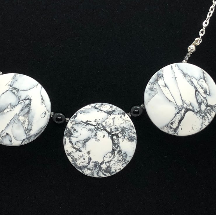 The circle beads are 3cm in diameter and separated by small black and silver beads. The total length of the necklace is approximately 46cm (18”), and is strung on a silver plated chain with a surgical steel carabiner.