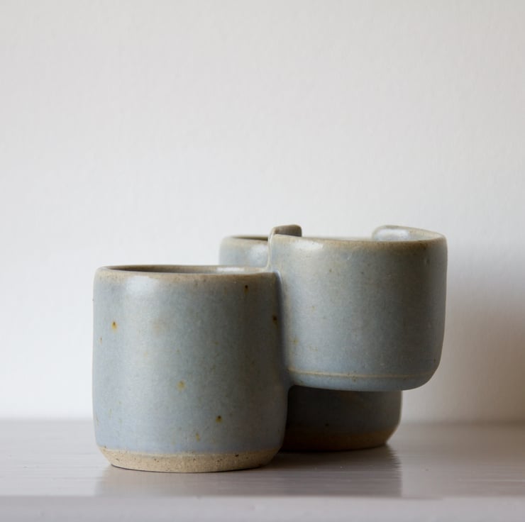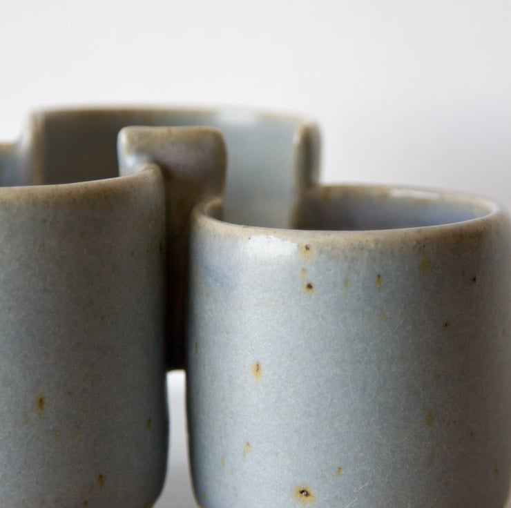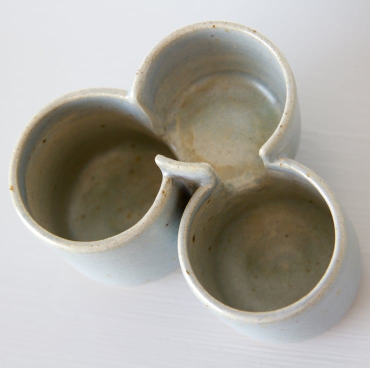 The glaze is pale blue with small 'blooms' or spots of brown where the iron content of the clay has reacted with it. Each of the three pots are linked up on the inside.