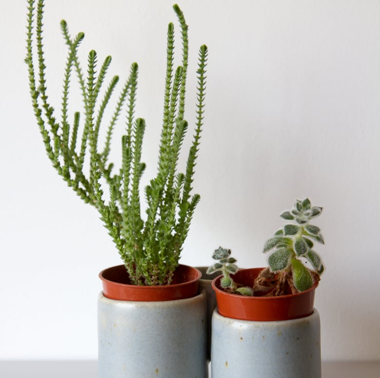 This was made while experimanting with different forms and sticking multiple thrown forms together. This one allows three small plants to be placed together in an unusual form.