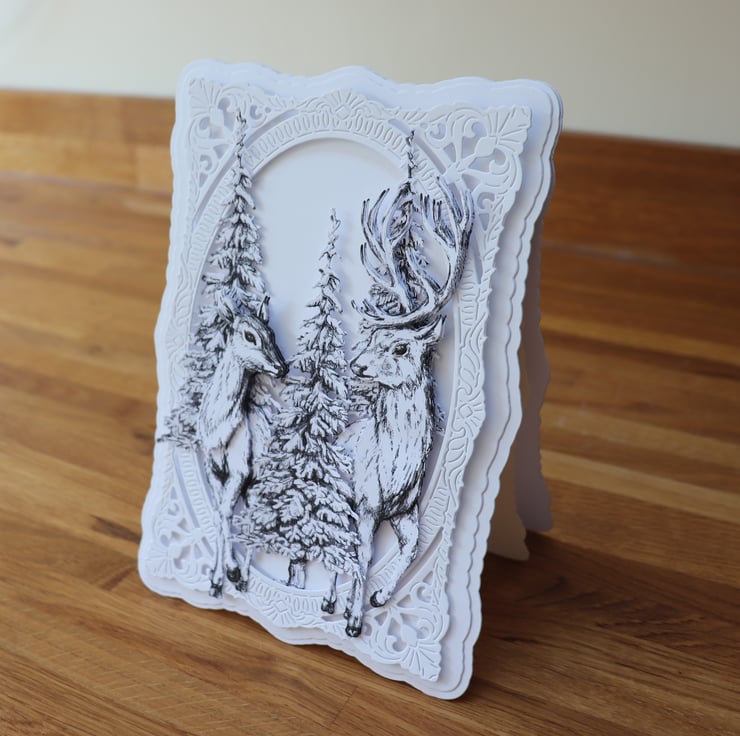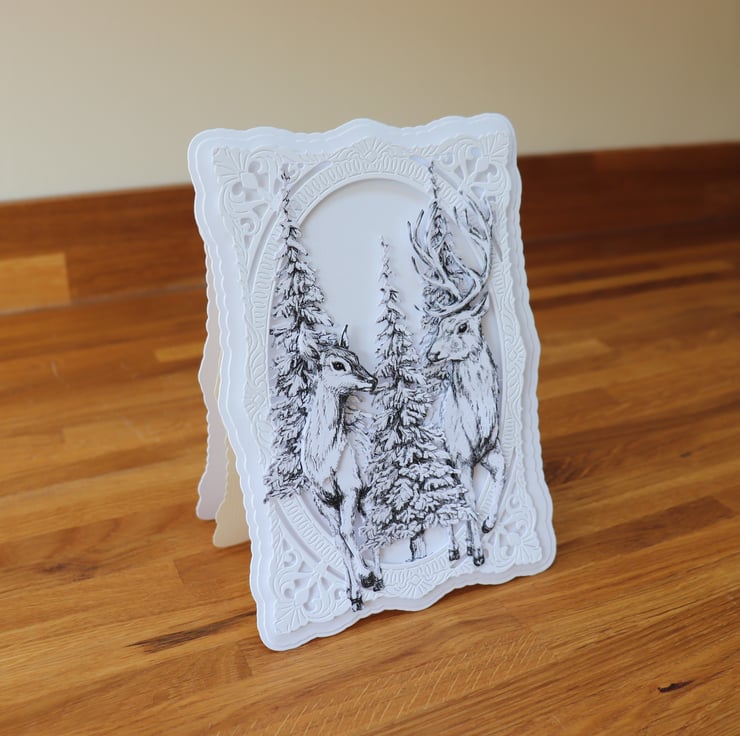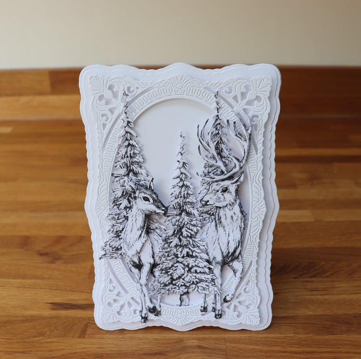 The card base and frame are cut from white card, and the fir trees, and animals are just as if they have been sketched, there is no sentiment with this card so it has multi uses.