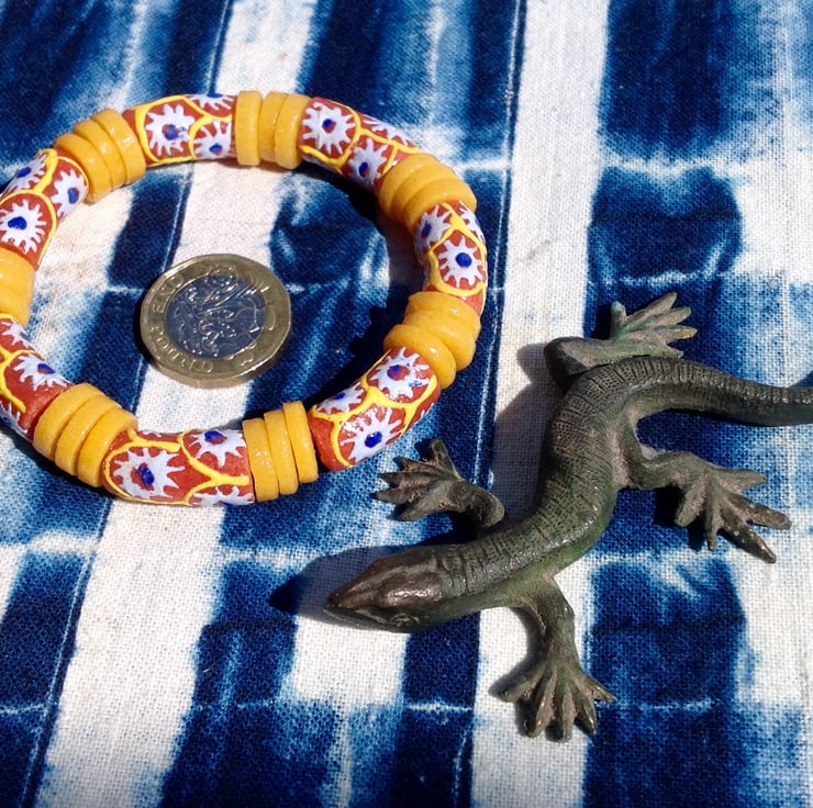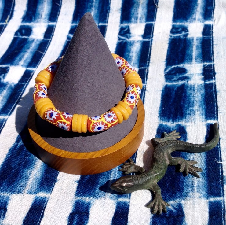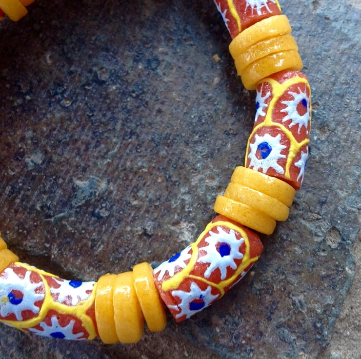 Handmade glass beads from the Krobo region of Ghana. Made in African village workshops from recycled glass and then strung here in Shropshire.