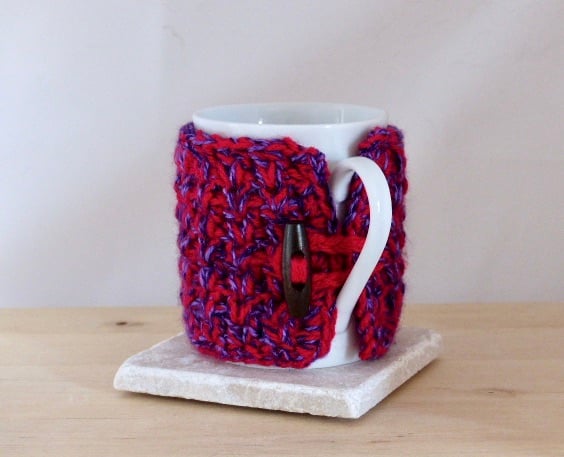 A bright crocheted cosy using two strands of yarn, one in red and one in purple. It measures approximately 25cm long by 8.5cm wide so should fit most standard mugs and has a crocheted loop and wooden toggle button to fasten it securely around your mug. An ideal gift for a tea/coffee lover.